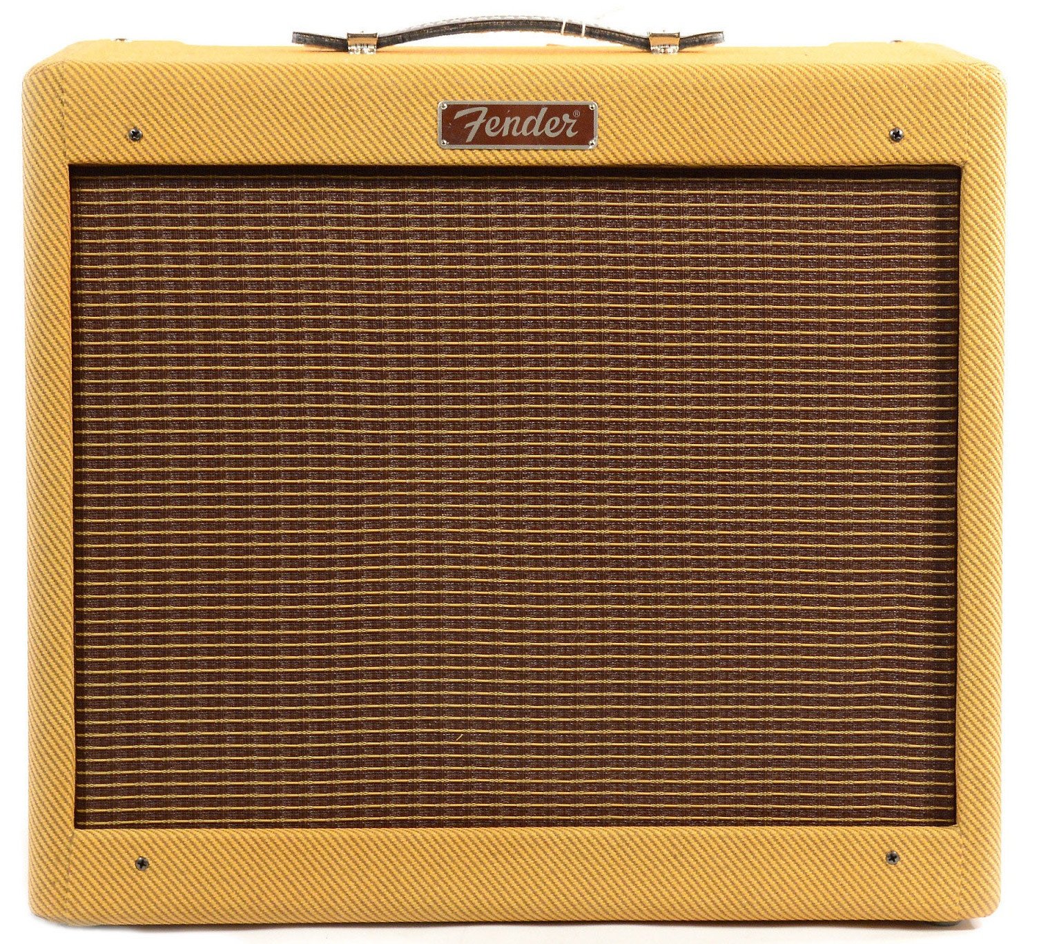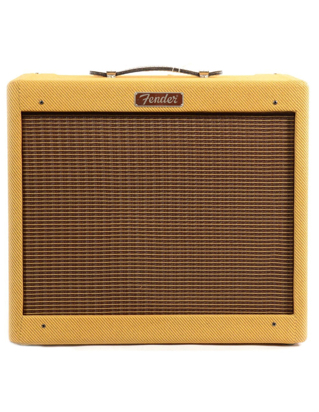 Fender Blues Junior Lacquered Tweed Electric Guitar Amplifier. The Fender Blues Junior Lacquered Tweed is a 15-watt electric guitar tube amplifier with 3 12AX7 tubes, 2 EL84 tubes, Volume controls, “Fat” Switch, Treble, Bass, Middle, Master, Reverb, 1 12” Jensen C12-N speaker. Tweed finish
