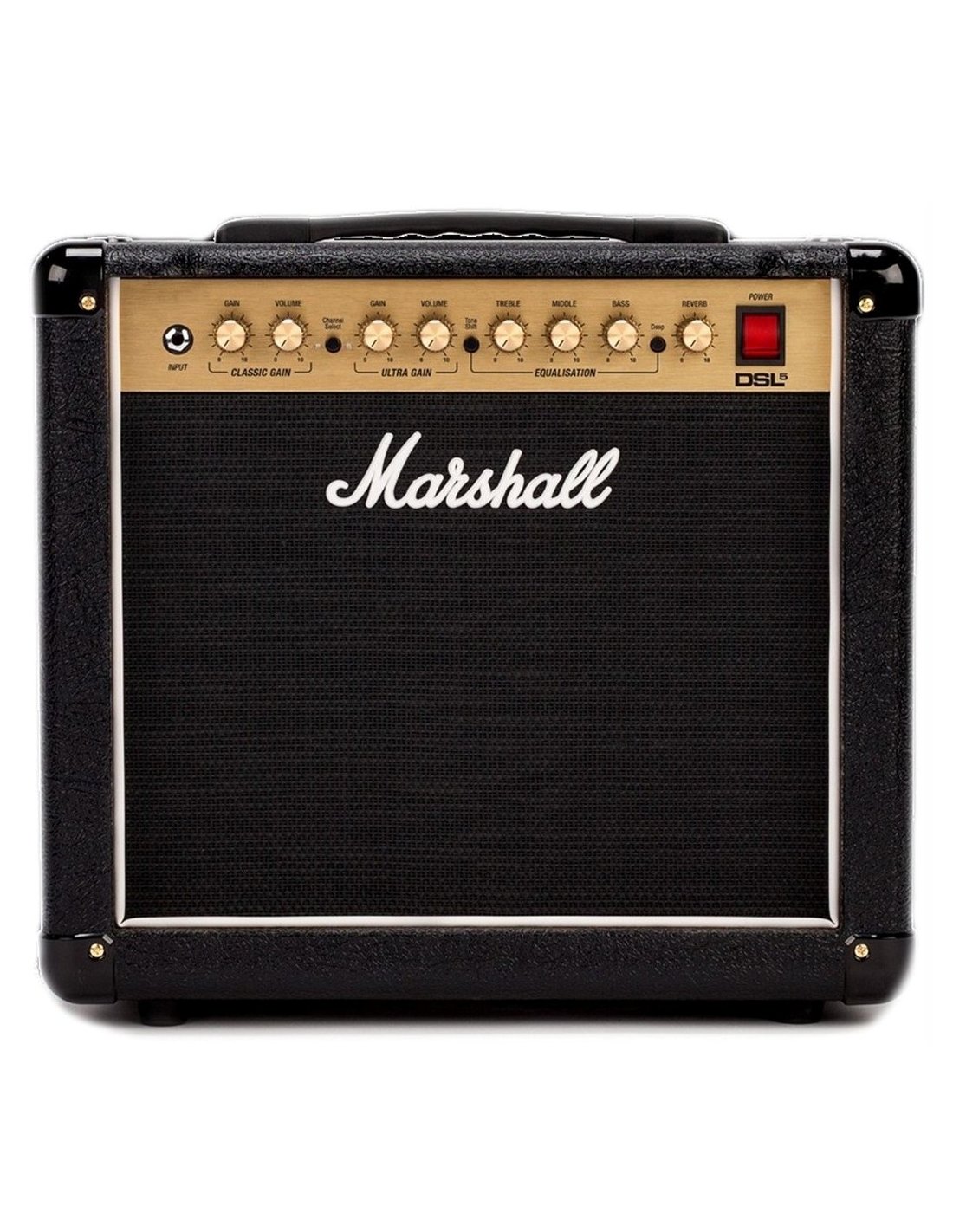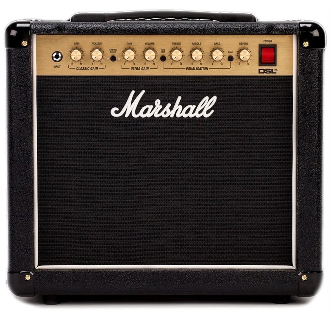 MARSHALL DSL5CR is a 2-channel tube guitar combo amplifier with a footswitch included. Technical features include a single 10" Celestion Ten-30 speaker with 5W power, 2 ECC83 preamp valves, 1 12BH7 final valve, volume and gain controls on both channels (Classic Gain, Ultra gain) 3-band Eq (Bass, Middle, Treble), 2 Eq filters selectable by button: Tone Shift and Deep Eq Shift, Reverb. It has speaker output via 1/4" jack, 0.5W low power speaker output, Aux input via 3.5mm TRS jack, FX send/return via 1/4" jack,