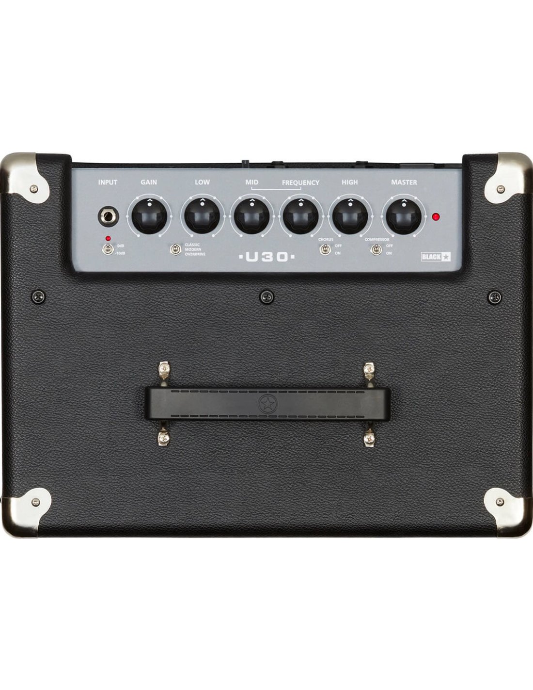 BLACKSTAR UNITY U-30. 30W 1x8” bass combo amplifier. Technical features include a single 8-inch Blackstar Custom speaker, 3-band equalizer with parametric average control, Gain and Master controls, 3 preamp stages selectable via switch (Classic, Modern, Overdrive), Chorus effect and compressor that can be activated through dedicated switches, Pad 0/-10Db. It has Line Out output via XLR and Jack with Ground Lift button, CabLink output via XLR, Mp3 Line In via 3.5 mm TRS jack