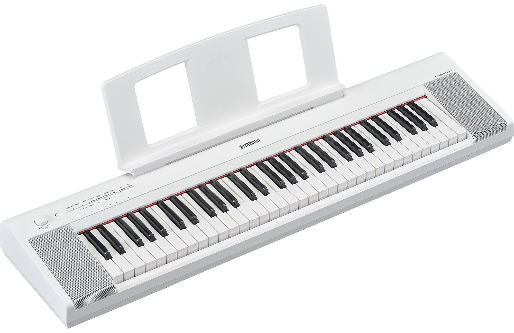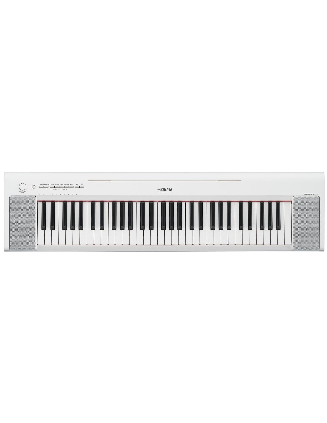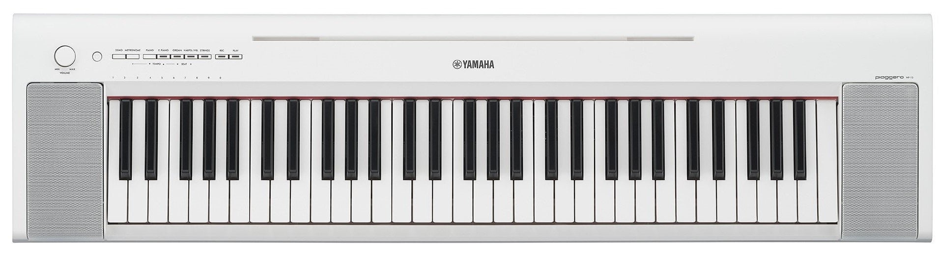 The NP15WH is a compact white Yamaha digital piano. It features 61 keys with a lighter touch that makes it easier for beginner pianists and a weight of only 5 kg for easy transport