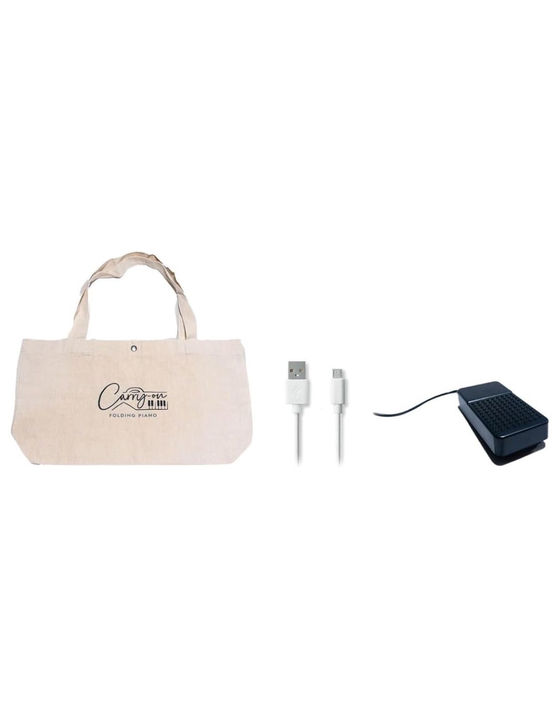 Kit composto da pianoforte pieghevole CARRY ON FP88 + custodia imbottita Oqan con tasca porta accessori e cinghie di trasporto. Il CARRY ON 88 è un dispositivo compatto, portatile e pieghevole che si trasforma in un pianoforte a 88 tasti e offre al musicista la libertà di suonare ovunque. È facile da usare ed è uno strumento ideale per principianti, insegnanti e musicisti itineranti. Dispone di altoparlanti integrati, uscita per cuffie, porta di ricarica USB per batteria interna ricaricabile, ingresso per pedale sustain (incluso) e molte altre funzioni e strumenti.
