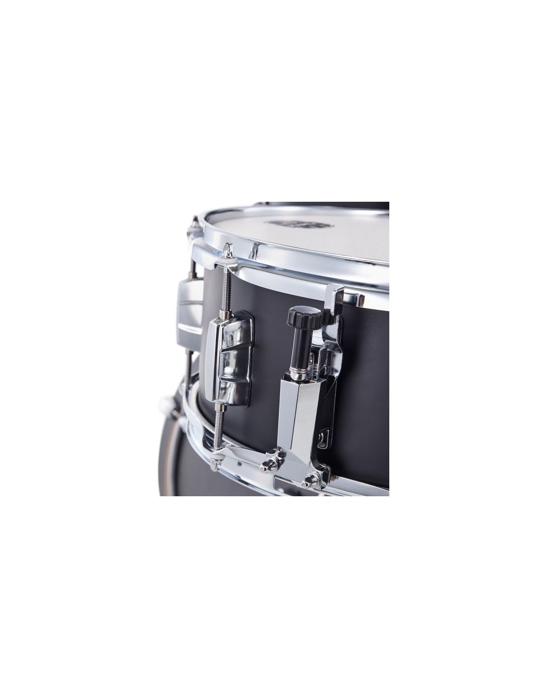 4-piece battery Matte Black KD case 18x14 Tom 10x7 Floor Tom 14x12 Snare in SD1450 finish 14x5 European Maple Barrels 7 layers 7.2 mm Circles 2.3 mm Power Hoops Hardware: Reggitom TH676 Rounded Edges with Soniclear System Soniclear Suspension System Lacquer Finish