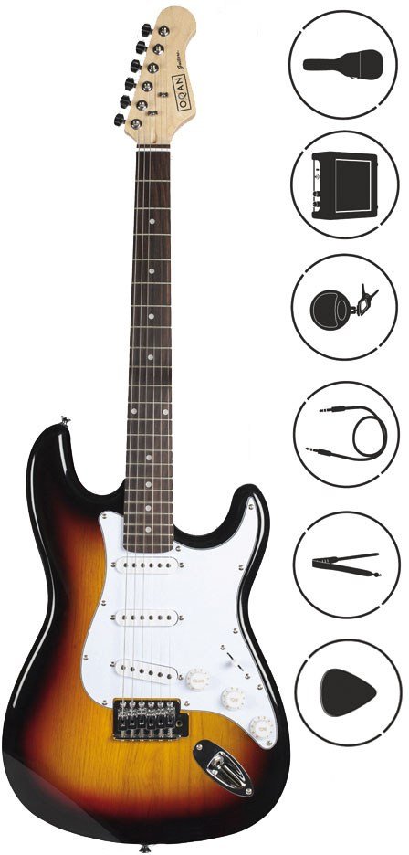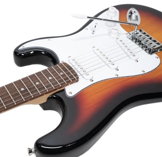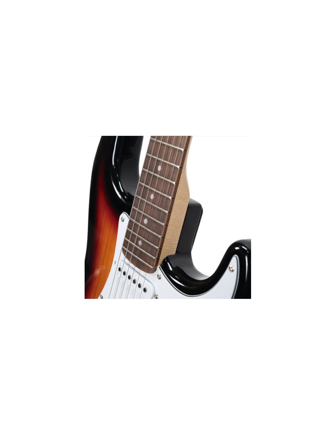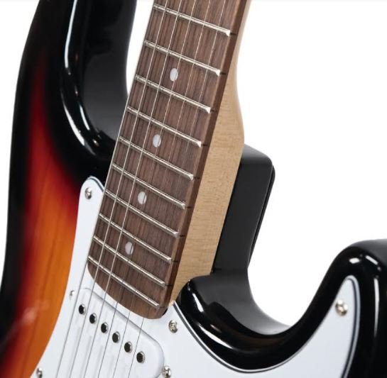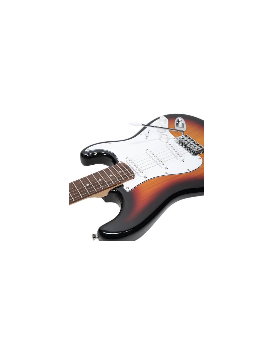 Electric guitar pack. Consisting of Strato type electric guitar and 10w amplifier. Guitar with linden body. 22 key rosewood compound keyboard. Maple fingerboard. 3 simple pickups. 5-position pickup selector. 1 volume and 2 tone potentiometer. Standard tremolo. Accessories included: 10W amplifier, case, digital tuner, cable, strap and 3 picks.