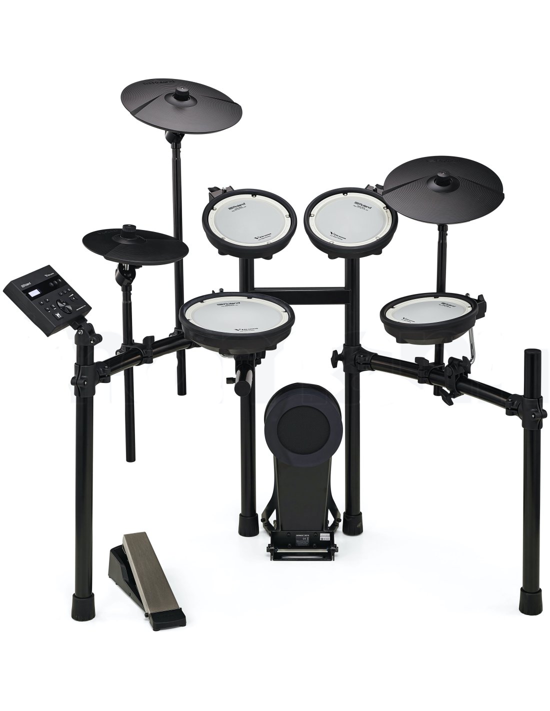 Compact and practical, ideal for playing at home, the TD-07KV offers the superior playability and expressiveness of the best V-Drums in a very affordable format.The original and very quiet double-layer Roland mesh skins are mounted on the snare and tom pads, while, to complete the kit, there are large crash and ride cymbal pads and a dedicated kick pad, with a realistic pedal response.