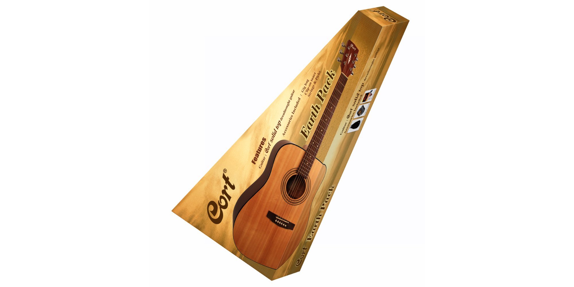 Cort Earth Pack OP Acoustic Guitar Set NATURAL color. The Cort Earth Pack OP Acoustic Guitar Set includes a Cort Earth60 acoustic guitar (with mahogany back and sides, solid spruce top, mahogany neck, rosewood fingerboard), an electronic tuner, a set of picks, a set of strings, a soft case and an educational DVD