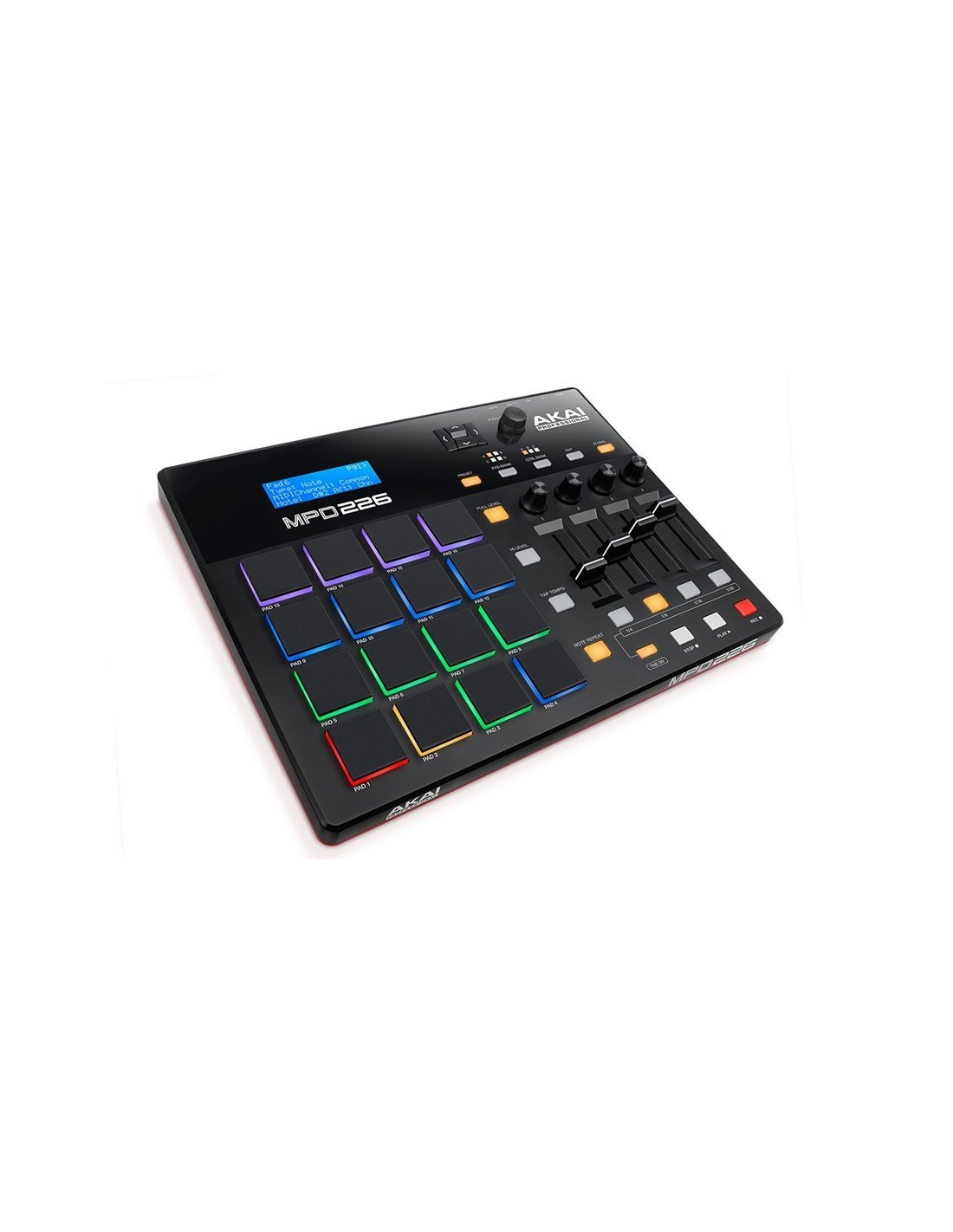AKAI MPD226 is a MIDI pad controller for music production with a combination of velocity-sensitive RGB pads, faders, knobs and keys, which allow virtual control of any parameter of the main DAW software. The technical features include 16 RBG backlit Thick Fat Pads sensitive to Velocity and Aftertouch, 64 Pads that can be assigned through 4 banks, 4 Assignable Faders, 4 Assignable Q-Link Knobs, 4 Assignable Q-Link Buttons, 36 Controls that can be assigned through 3 banks, functions: Classic MPC Note Repeat, MPC Swing, 16 Level, Full Level and Tap Tempo, 30 total Presets with configurations for the most popular DAWs and OLED management displays. It has MIDI In/Out connections via 3.5mm mini jack, USB slot. Includes Ableton Live Lite, Akai Pro MPC Essentials, Sonivox Big Bang Cinematic Percussion and Big Bang Universal Drums software
