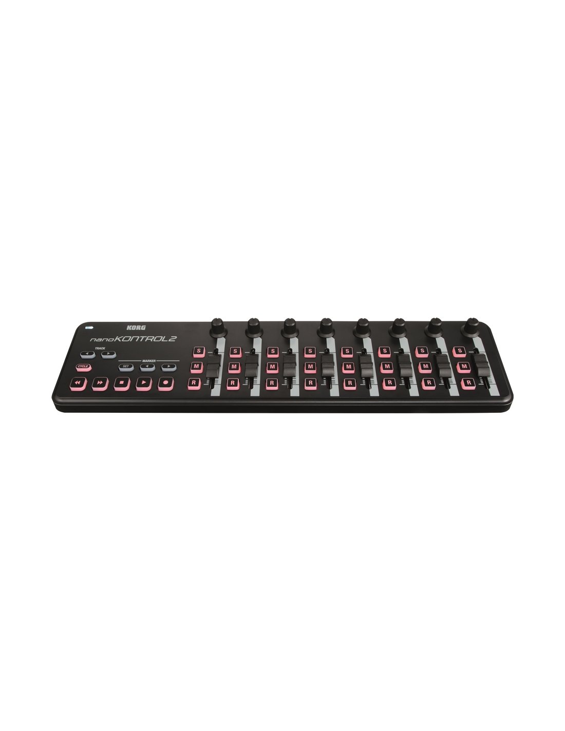 KORG NANOKONTROL2-BK is a compact and versatile USB MIDI controller designed for music production and live performances, which offers a wide range of controls for managing software parameters and has a dedicated transpose section for an intuitive workflow. Technical features include 8 faders for controlling Volume, Pan, Send and other parameters, 8 Encoders for controlling parameters such as EQ, filter and reverb, 24 backlit buttons for various functions including recording, Mute, Solo, Punch in/out, dedicated transport buttons for playback, pause, recording, loop and fast forward/backward, Marker button to set and recall markers in DAW software, Shift button to access secondary functions and MIDI Learn button to assign controls to customized software parameters. The controller is pre-mapped for major DAW software such as Ableton Live, Cubase, Logic Pro and Pro Tools, ensuring immediate operation without complex configurations. Includes KORG Kontrol Editor for detailed customization of