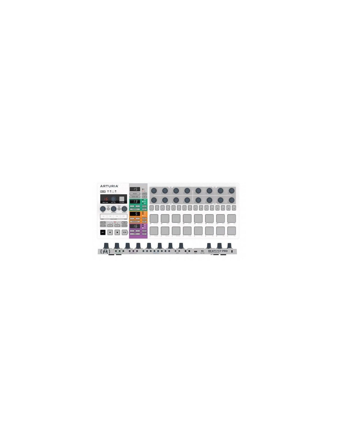 ARTURIA BEATSTEP PRO is a control surface with rotating Pads and Encoders that can also be used as a standard controller and as a double Step Sequencer. Technical features include 2 monophonic step sequencers with up to 64 steps per sequence, note, velocity and gate time settings per step, 16-track drum sequencer (one track per pad), MIDI controller mode, sending MIDI CC messages, note data, program change, 16 projects, each with 16x2 sequences, 16 drum sequences and a controller map, performance controls, Randomizer with amount settings, Touch strip with looper/roller in real time, touch-sensitive potentiometers, Tap Tempo function, ; CV/GATE outputs, 8 drum gate outputs, Clock sync with multiple standards, MIDI In/Out with supplied adapters, USB class compliant and Kensington