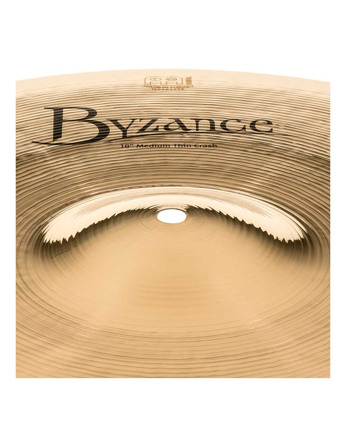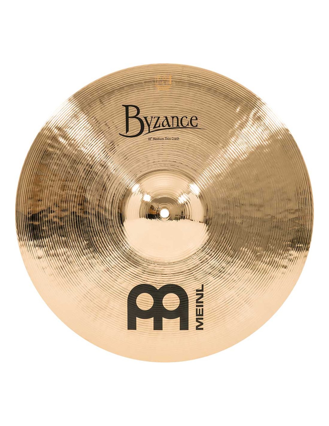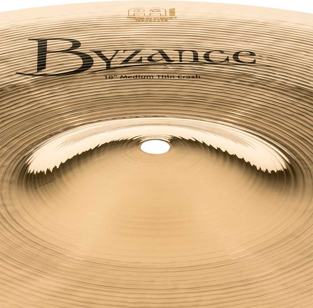 'Crash 18" Medium Thin, Byzance Brilliant Series. The Byzance Brilliant series plates are handcrafted in our factory in Turkey by specialists and respecting tradition throughout the process. All plates are made with B20 bronze alloy discs. Various techniques are involved in the process, both hammering and turning. In addition to this, they receive a glossy lacquer that gives them a more explosive sound and a spectacular glossy finish.