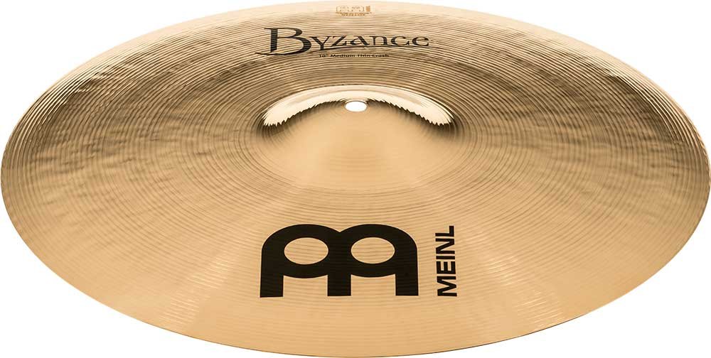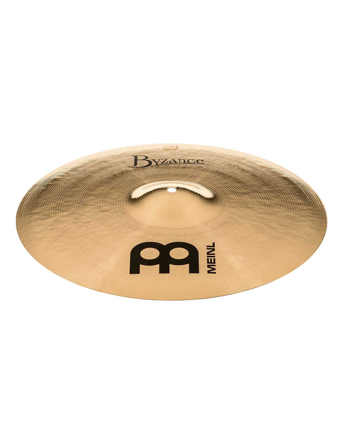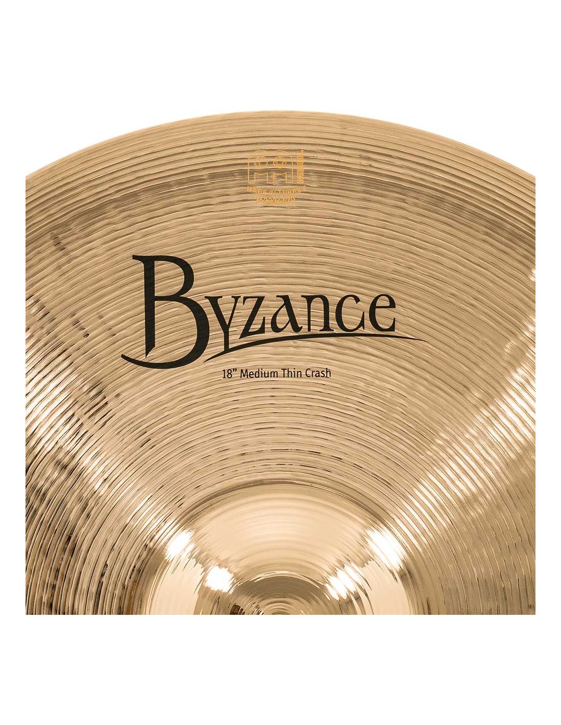 'Crash 18" Medium Thin, Byzance Brilliant Series. The Byzance Brilliant series plates are handcrafted in our factory in Turkey by specialists and respecting tradition throughout the process. All plates are made with B20 bronze alloy discs. Various techniques are involved in the process, both hammering and turning. In addition to this, they receive a glossy lacquer that gives them a more explosive sound and a spectacular glossy finish.