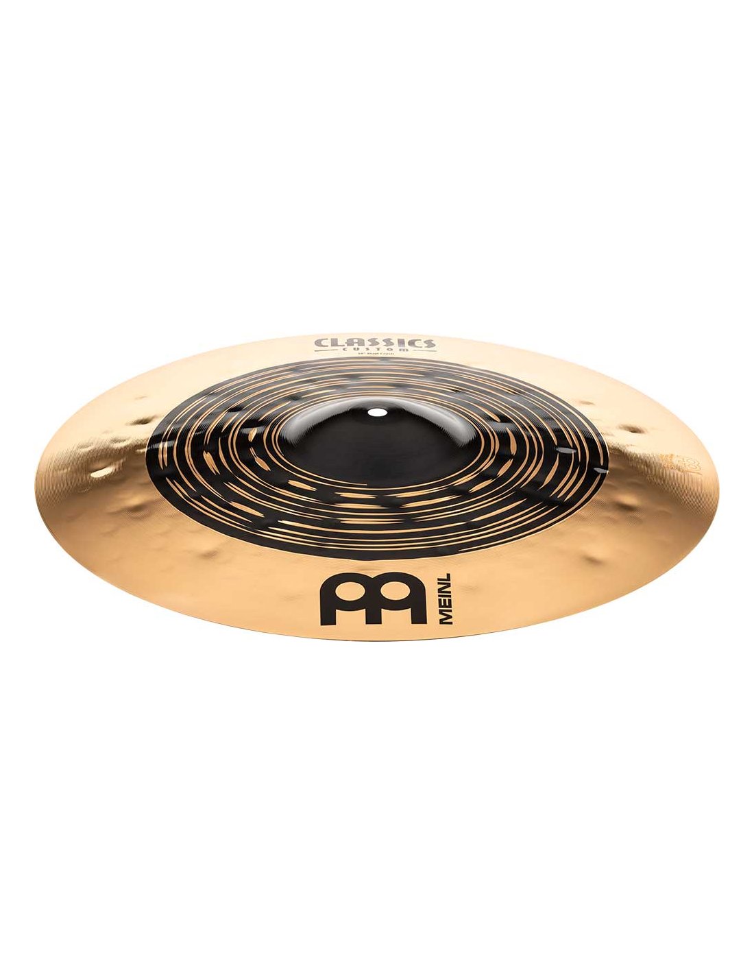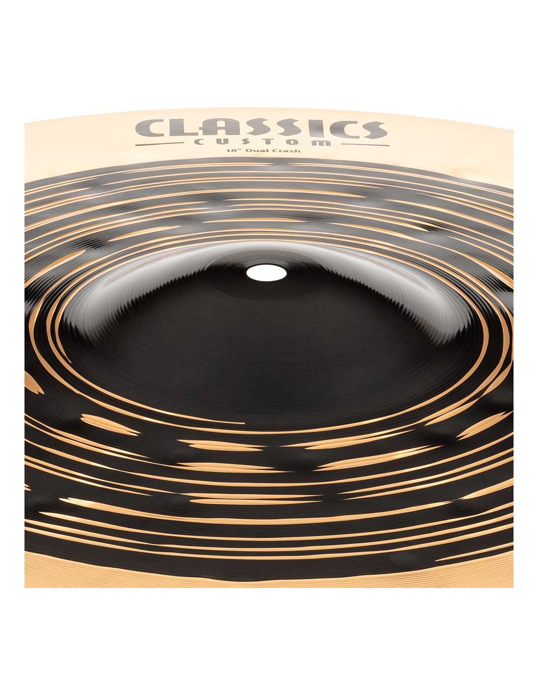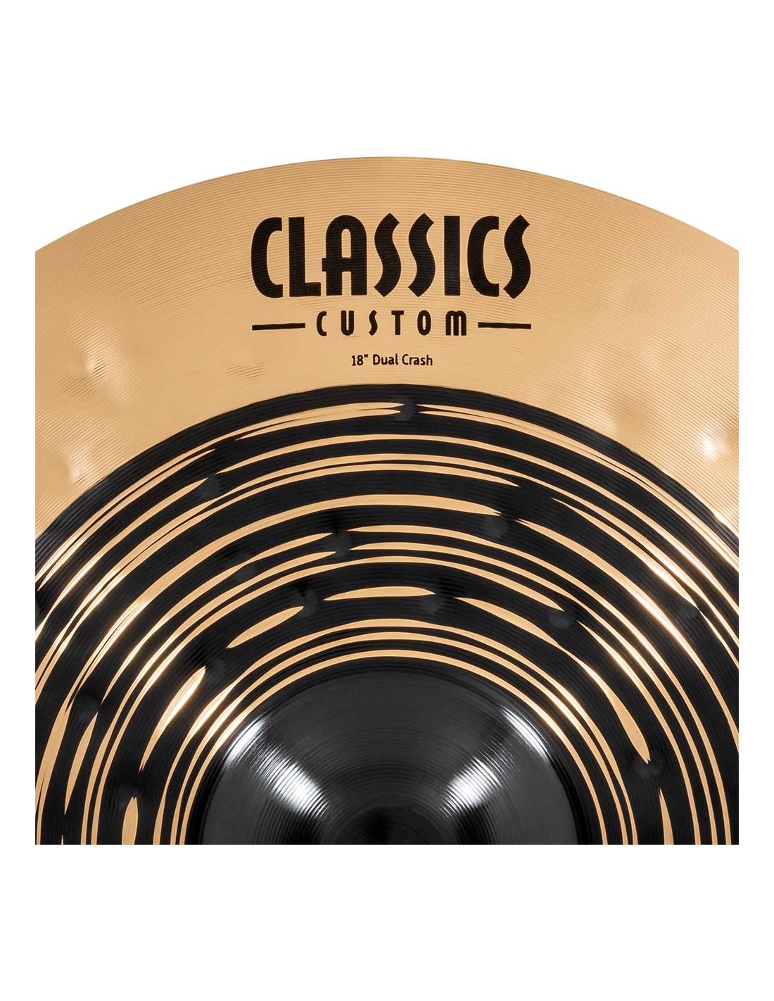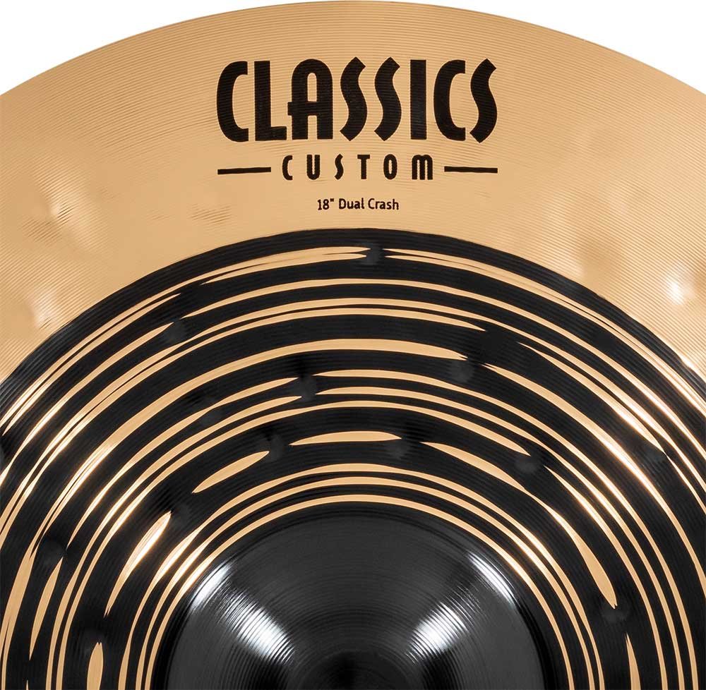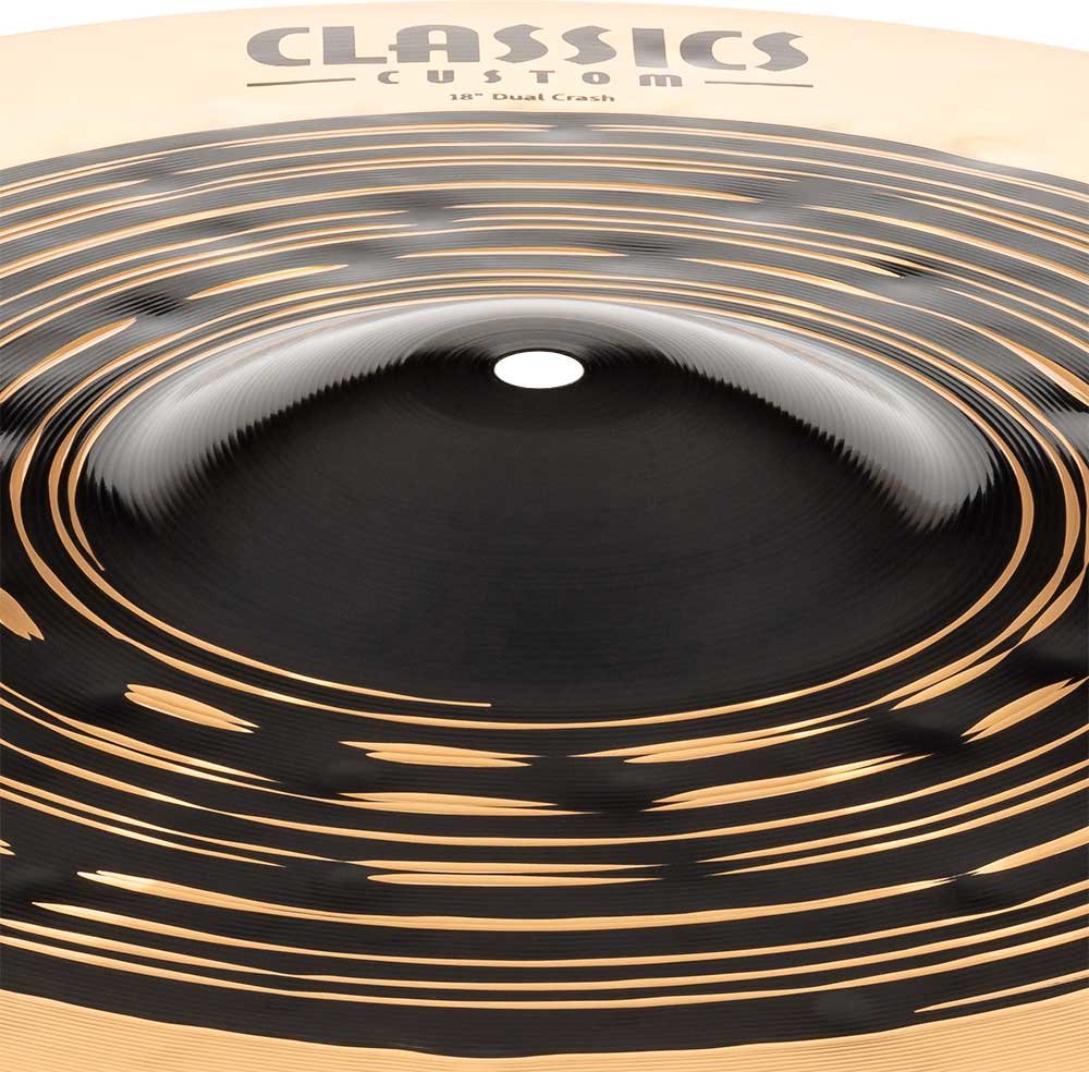 'Classics Custom Dual 18" Crash. The new Classics Custom Dual have spectacular aesthetics, but their sound characteristics are even more so. The dark base sound, the turning and the shiny outer part, give great versatility and excellent response to the rod. The dark central part gives the plate an explosive and powerful character. The plates are made in Germany, with B12 Bronze alloy. We also consider it important to emphasize that they are made from 100% renewable energy that we produce in our plant.