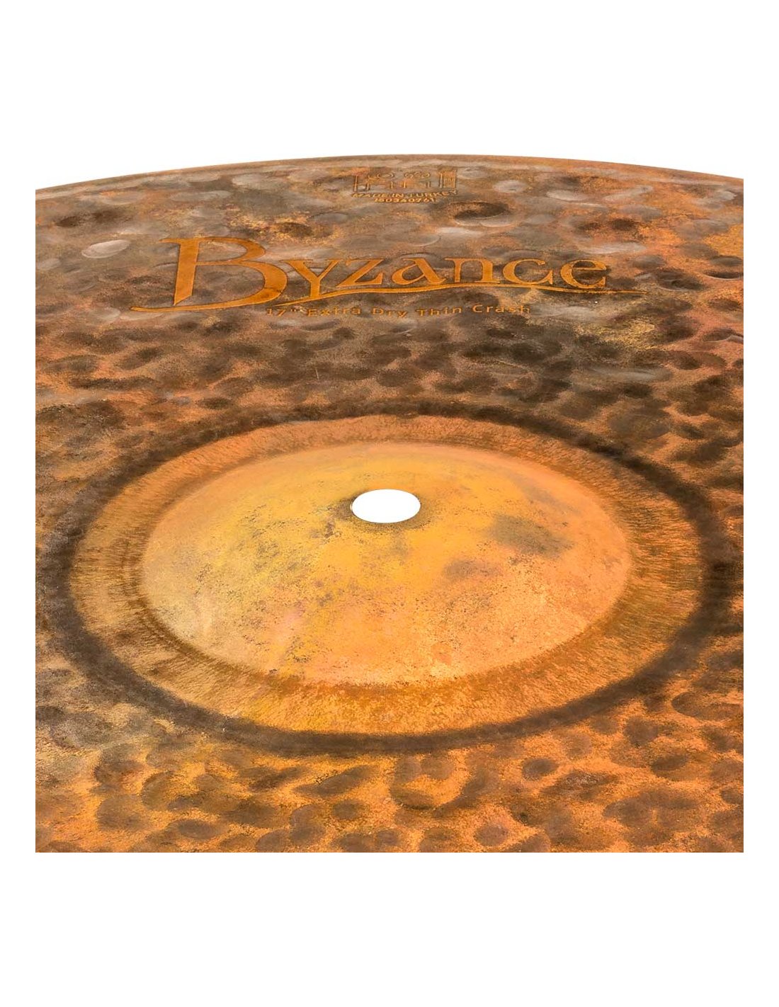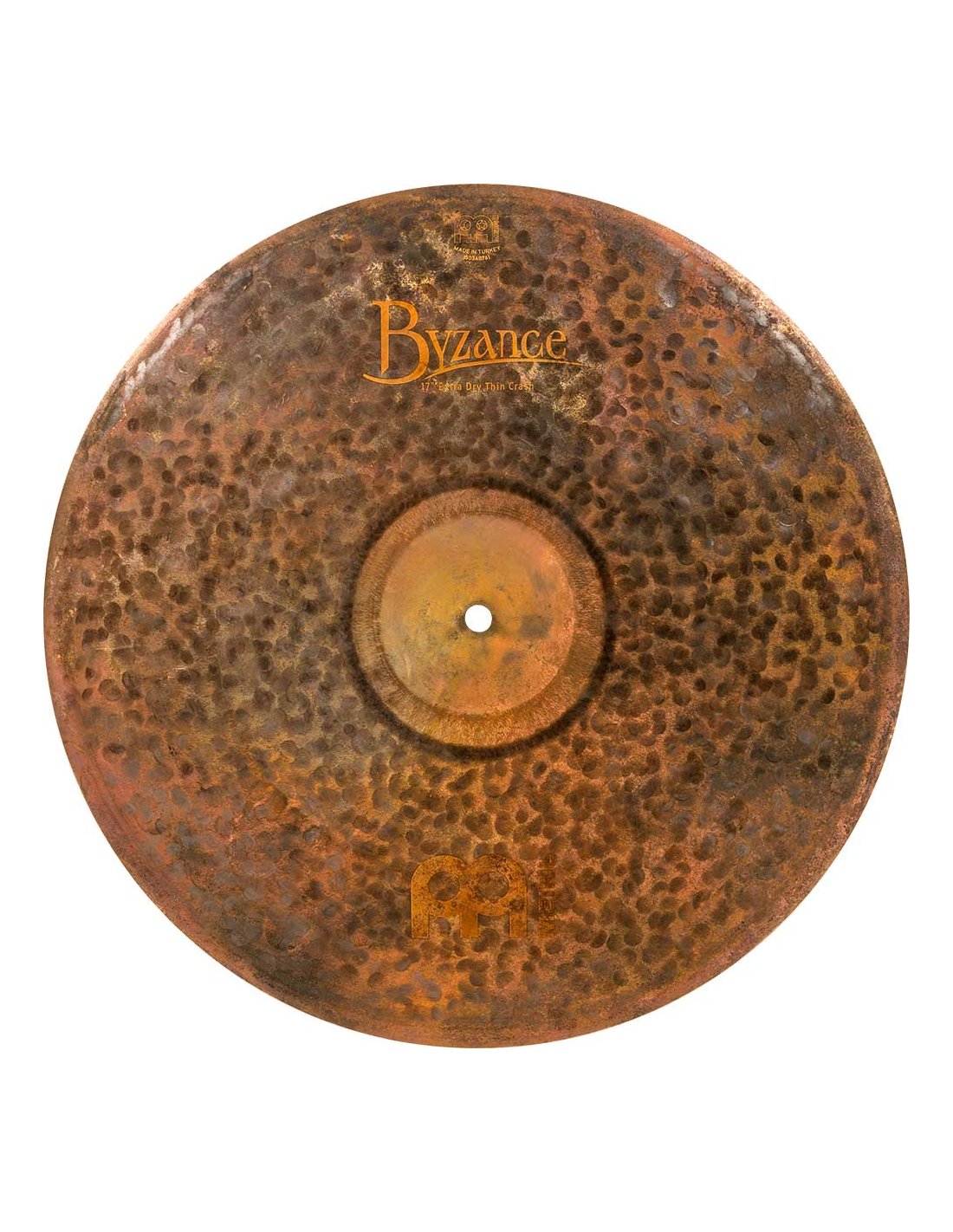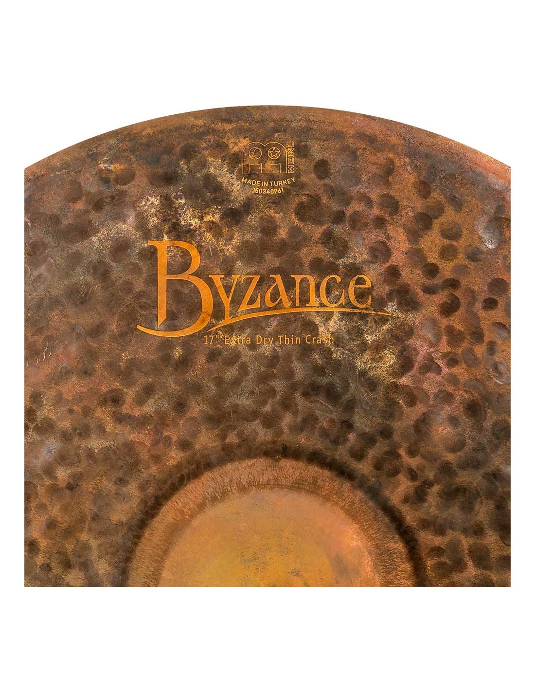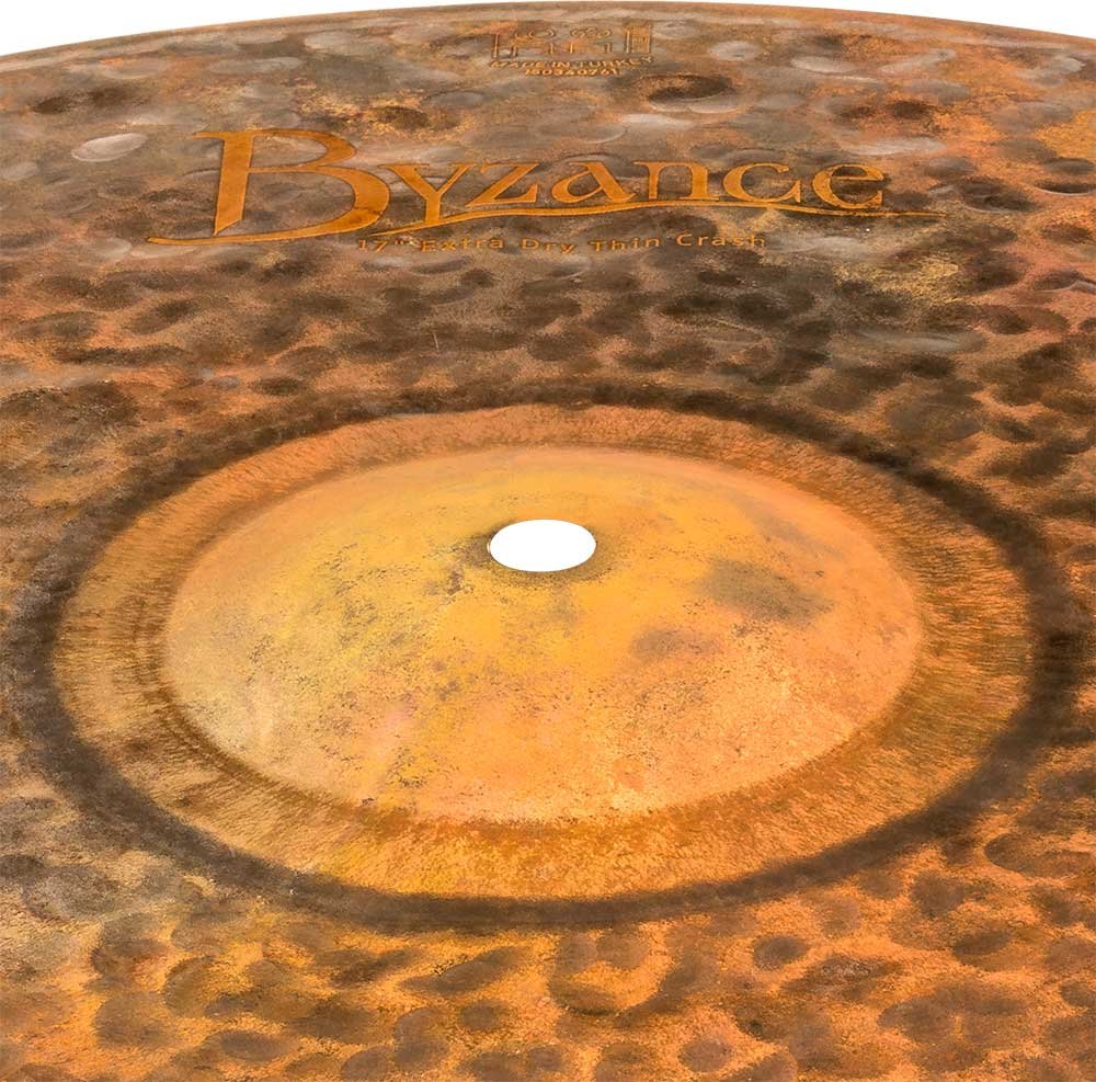 'Crash 17" Thin, Byzance Extra Dry Series. The plates of the Byzance Extra Dry series are handcrafted in our factory in Turkey by specialists and respecting tradition throughout the process. All plates are made with B20 bronze alloy discs. Several techniques are involved in the process, both hammering and turning. The unlathed top finish and the larger diameter hammered finish together with the fully lathed bottom of the plate make the series unique. With an explosive sound, a bit trashy and with little sustain. These plates have created a completely unique new sound universe.