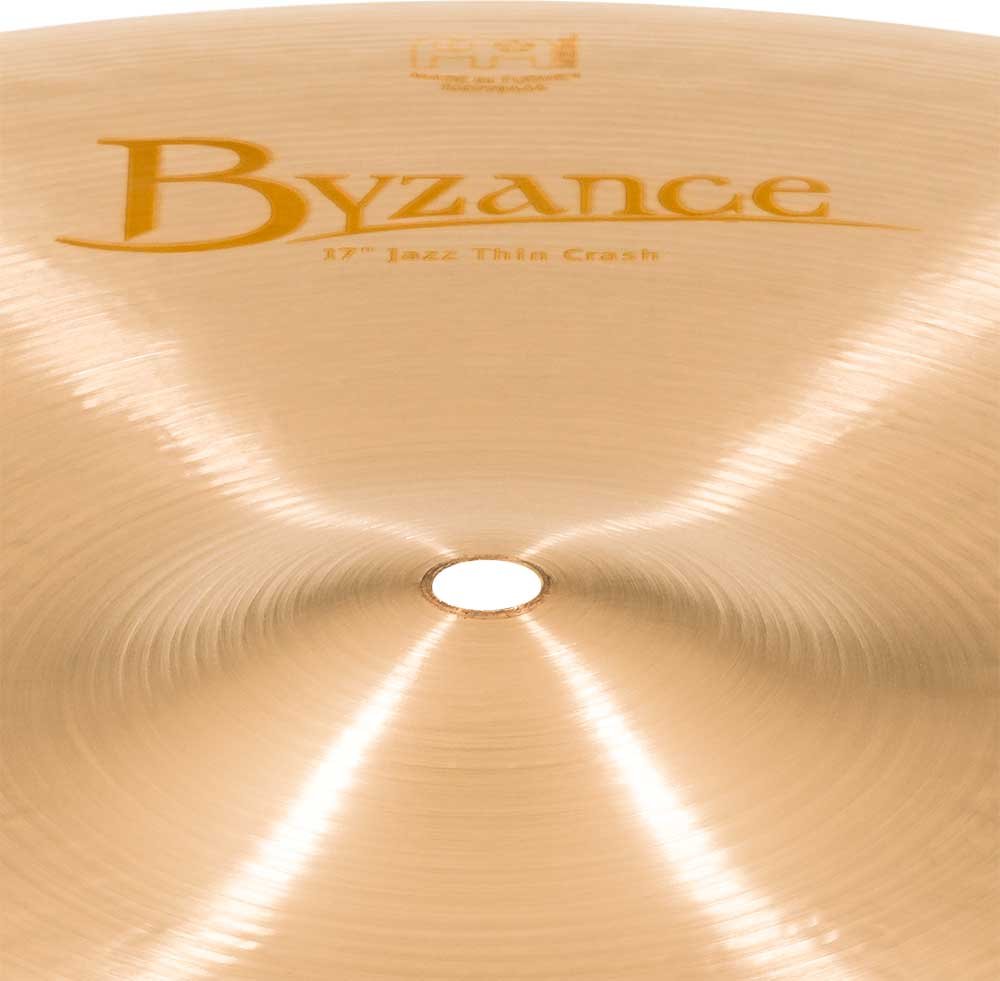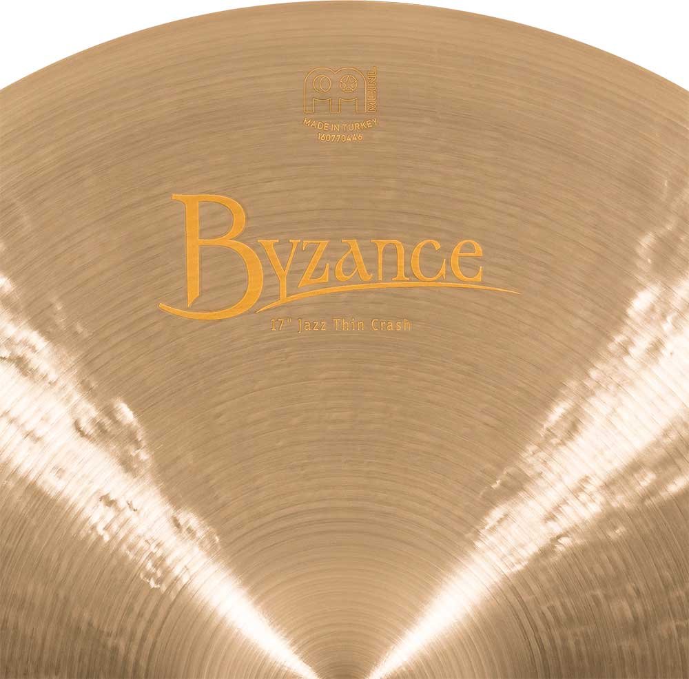 'Crash 17" Thin, Byzance Jazz Series. The Byzance Jazz series plates are handcrafted in our factory in Turkey by specialists and respecting tradition throughout the process. All plates are made with B20 bronze alloy discs. Several techniques are involved in the process, both hammering and turning. The fine turning together with the massive hammering makes this series a sound cushion for any pop, jazz, fusion environment....