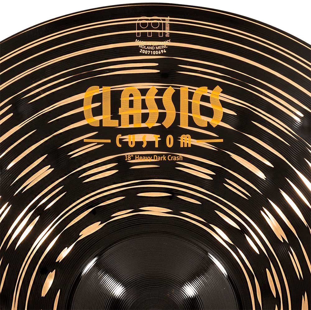 “'Heavy Crash 18" Classics Custom Dark Series. The Classics Custom Dark series cymbals are mechanically produced in Germany on B10 alloy. The process involves various techniques, both pressing and computerized hammering. In addition to this, they have a glossy black finish that gives them a spectacular appearance and a particular sound.