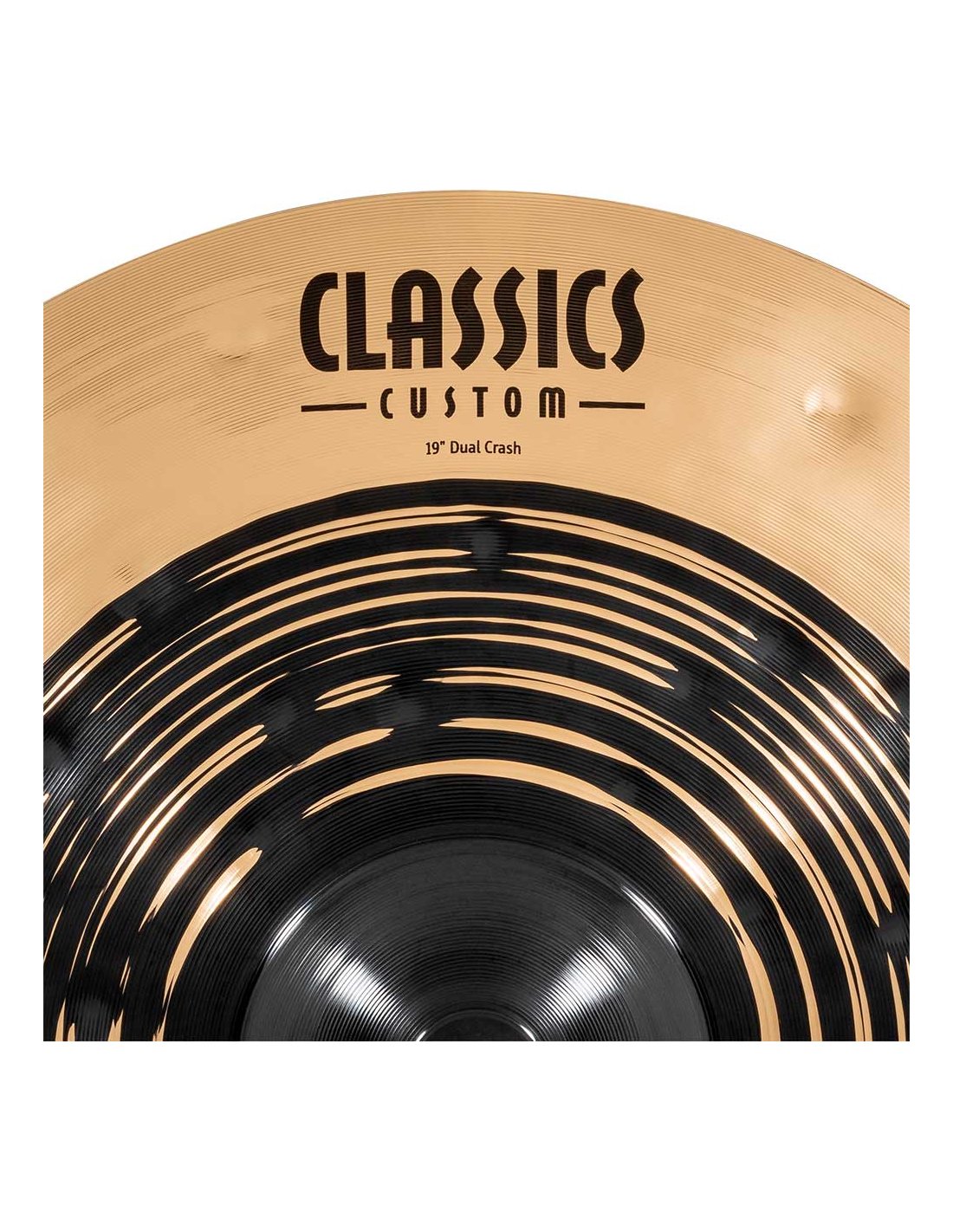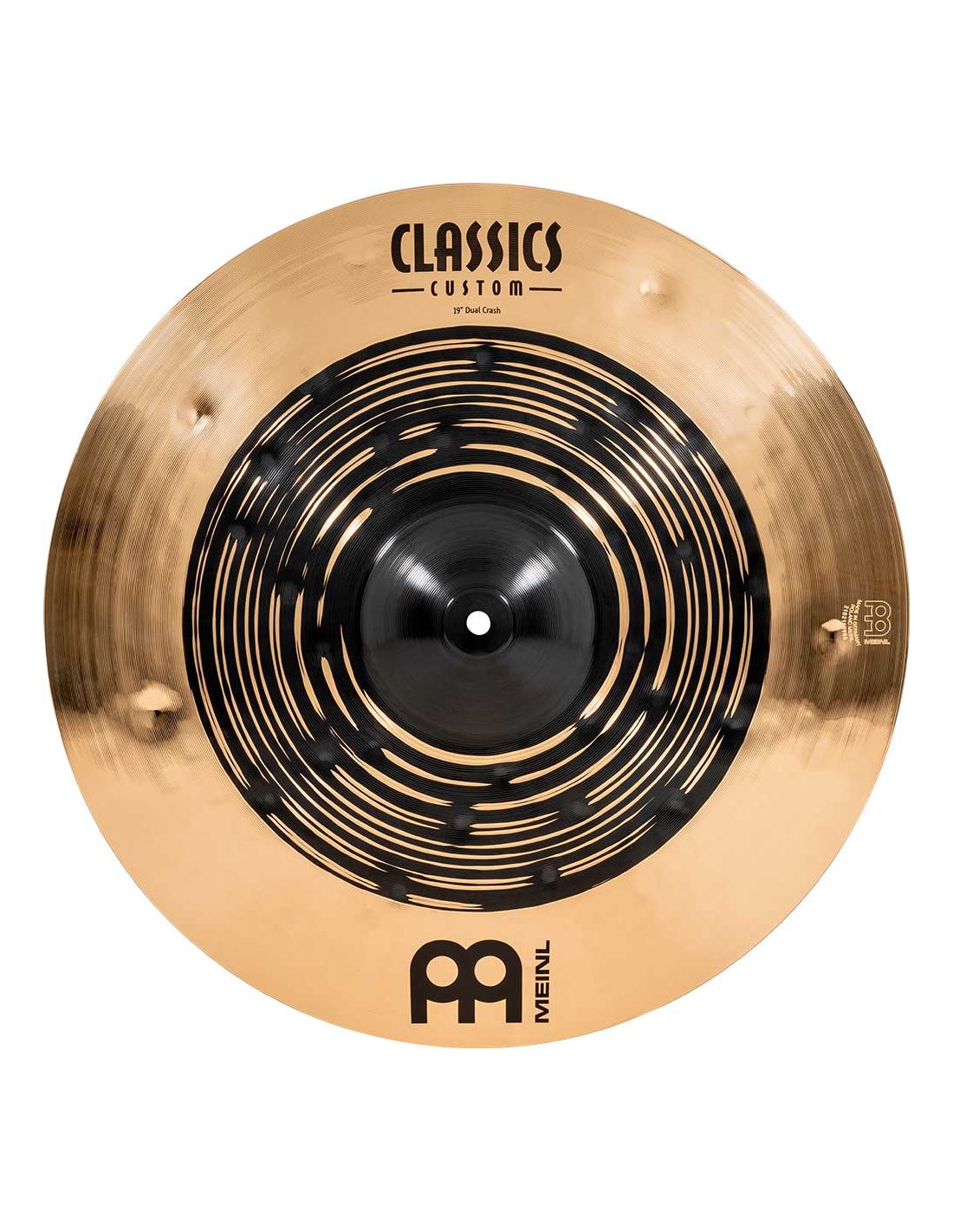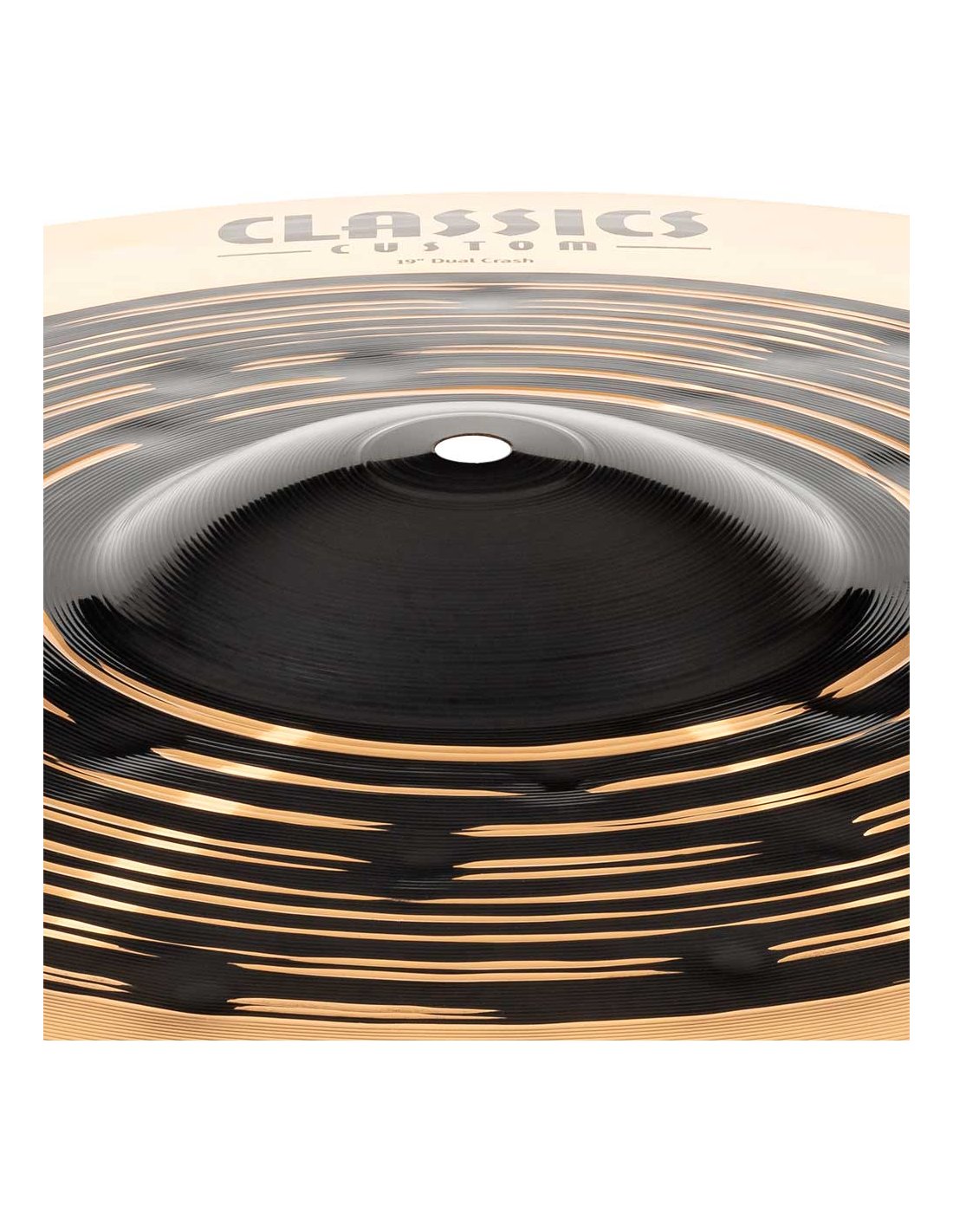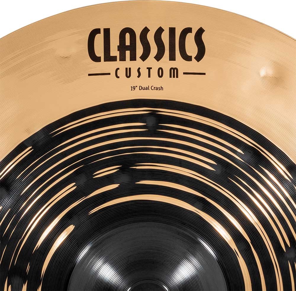 'Classics Custom Dual 19" Crash. The new Classics Custom Dual have spectacular aesthetics, but their sound characteristics are even more so. The dark base sound, the turning and the shiny outer part, give great versatility and excellent response to the rod. The dark central part gives the plate an explosive and powerful character. The plates are made in Germany, with B12 Bronze alloy. We also consider it important to emphasize that they are made from 100% renewable energy that we produce in our plant.