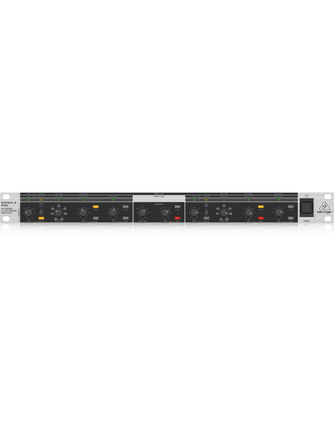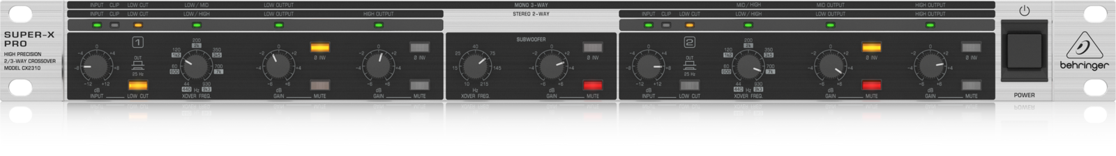 BEHRINGER CX2310 V2 is a 2-way/mono 3-way rack stereo crossover with subwoofer output and Linkwitz-Riley filters with 24dB/octave. Technical features include Gain output controls on all frequency bands, Mute seIectors, input control command with low cut filter, Xover Freq commands on each band, phase inversion seIectors, servo-balanced XLR connectors