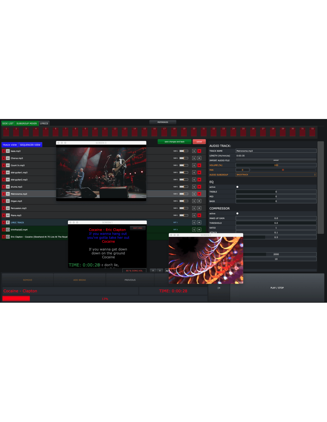Sequence management software for live performance WHAT IS LIVETRAKER? Many musical formations, given the complexities of reproducing a complete sound, perhaps made in the studio, need to introduce external sound elements into their show. It is no coincidence that almost all first-rate artists today make extensive use of sequences in live concerts. But bands today also need to pilot videowalls, screens, manage clicks, have the texts on stage, send presets changes to keyboards and effects, or send Midi controls to DMX control units. To do this, many bands use systems that are too much limited, such as cellphone/tablet apps, or extremely complex such as sequencers. These software are not the solution because they are not created for this purpose! However, it often happens that artists, in the absence of a concrete alternative, improperly use these tools that cannot reach the level of completeness, reliability and ease of use of LIVETRAKER. LIVETRAKER is the only product in the world created specifically for this purpose, designed and designed by musicians to manage a live performance. LIVETRAKER can manage an entire show with the sole aid of a modern consumer-level notebook, reducing costs by up to 95% compared to other solutions and increasing ease of use by 85%. VIDEOvideo management is one of LIVETRAKER's strengths: up to 4 video destinations can be managed simultaneously, including 3 external screens***, each with a different assignment, for an impressive stage effect. AudioLiveTraker can manage unlimited audio tracks, each of which has its own mixer and a series of digital effects in non-destructive realtime, such as equalizer, compressor, reverb, delay. LIVETRAKER is ASIO compatible so it supports 99% of audio interfaces up to 64* mono (or 32* stereo) outputs. TEXTS (LYRICS) The texts are managed through an integrated, clean and fast editor, which allows you to customize every single line and create the classic “electronic hunchback” in a few clicks. MidiLiveTraker has a complete set dedicated to the management of Midi commands, to send multiple program changes to control keyboard presets, effects, control DMS control units and more. MTC is obviously 100% supported. SONG & PLAYLISTSSong management is as powerful as it is simple to use. You can select different media (video, audio etc...), integrate texts and effects and once saved you will get a simple folder containing the entire project. All configurations are saved in a single small file, while the original media will never be modified.Features & RequirementsThe dual nature of MAC and WINDOWS allows you to easily transfer a playlist from one machine to another: just swap folders! LIVETRAKER is a very light software that “weighs” only 60 MB, a result that allows the software to load 100% into the host computer's RAM memory, thus ensuring maximum execution speed. Furthermore, it does not install any proprietary driver or codec, that is, it always uses the one of the host machine, thus avoiding any problem of incompatibility. For the full list of features and requirements click here Unlimited LicenseYou can install LIVETRAKER on a USB Flash Drive and use it on all the computers you owned***, without the need to purchase multiple licenses. Once the license is activated, it is no longer necessary to have an internet connection to launch the program during the live broadcast. NB: Once activated, the license cannot be modified and/or replaced in any way