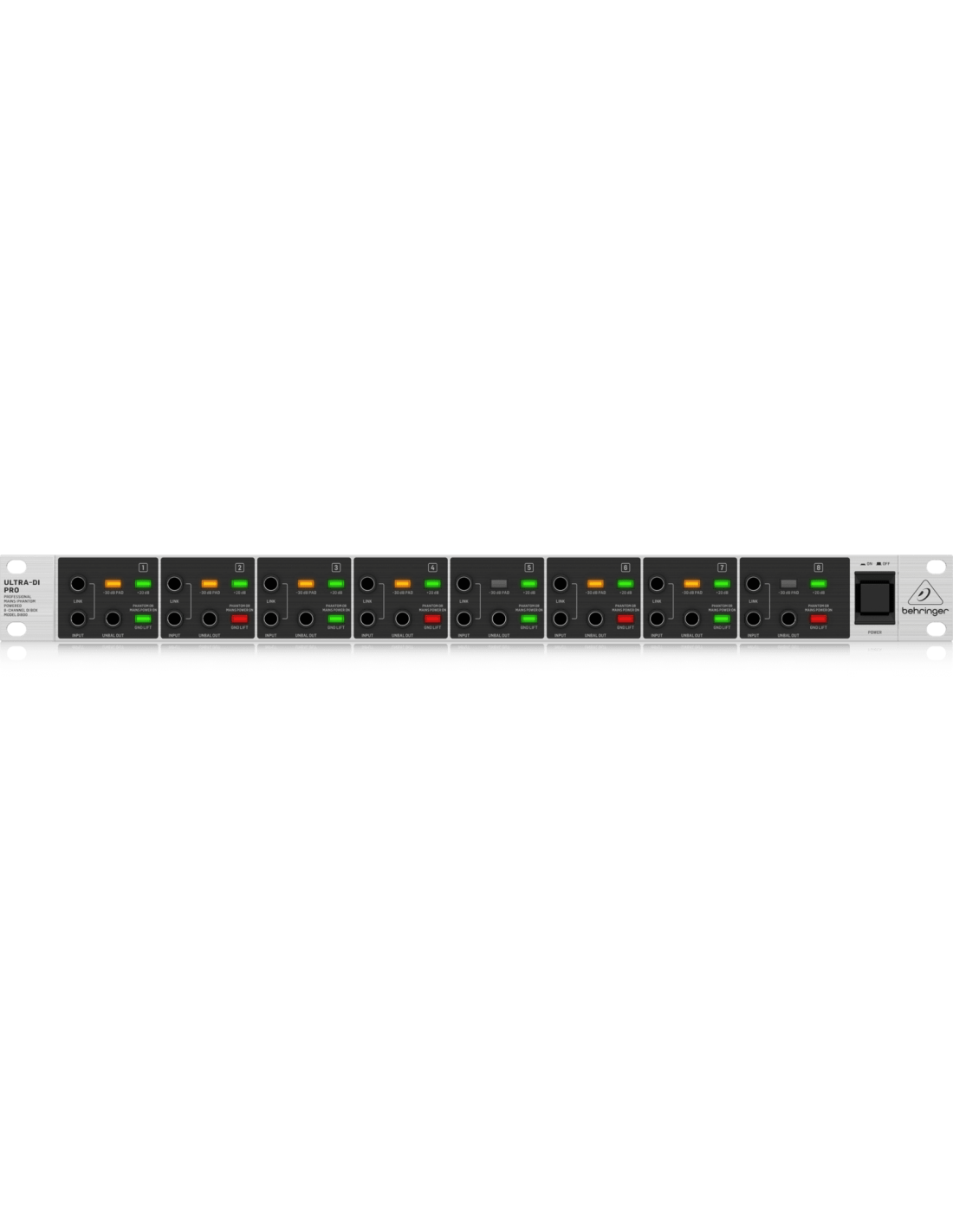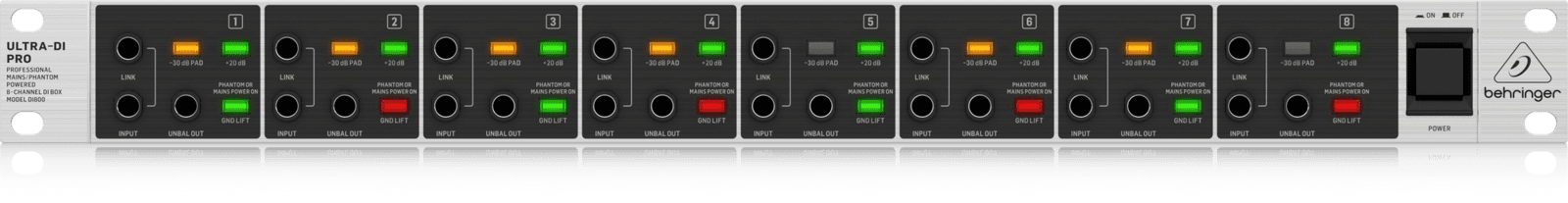 BEHRINGER DI800 V2 is a D.I. box with 8 rack channels. It has 8 buffered TRS inputs, link output for connection to other devices, unbalanced output, Gain switch +20db, switch for -30db of attenuation pad. The rear panel has 8 balanced XLR outputs