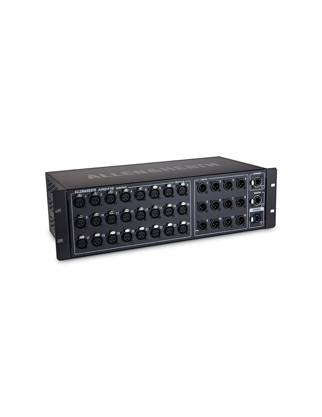 .Rack audio (24 XLR IN and 12 XLR OUT). Possibility to be connected to up to 2 Mod expanders. AR84 (8 XLR IN, 4 XLR OUT each) with CAT5 up to 120 m using the A&H dSnake protocol. dSnake provides control to remote preamps, and all mic preamps are recallable scenes. The AR2412 also includes a connection for personal monitoring systems