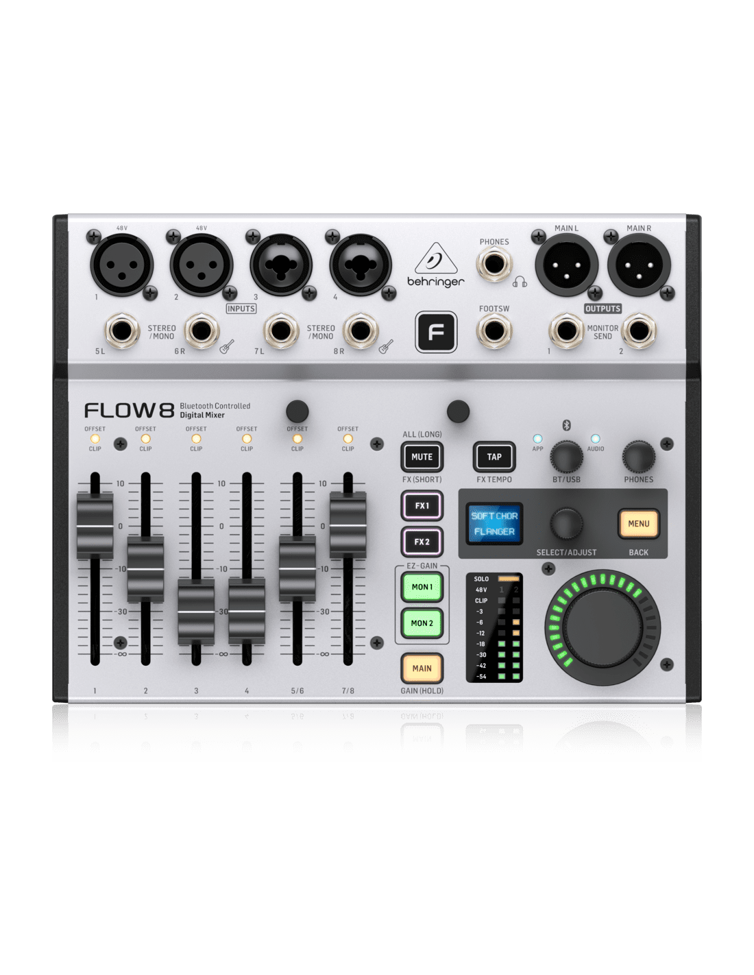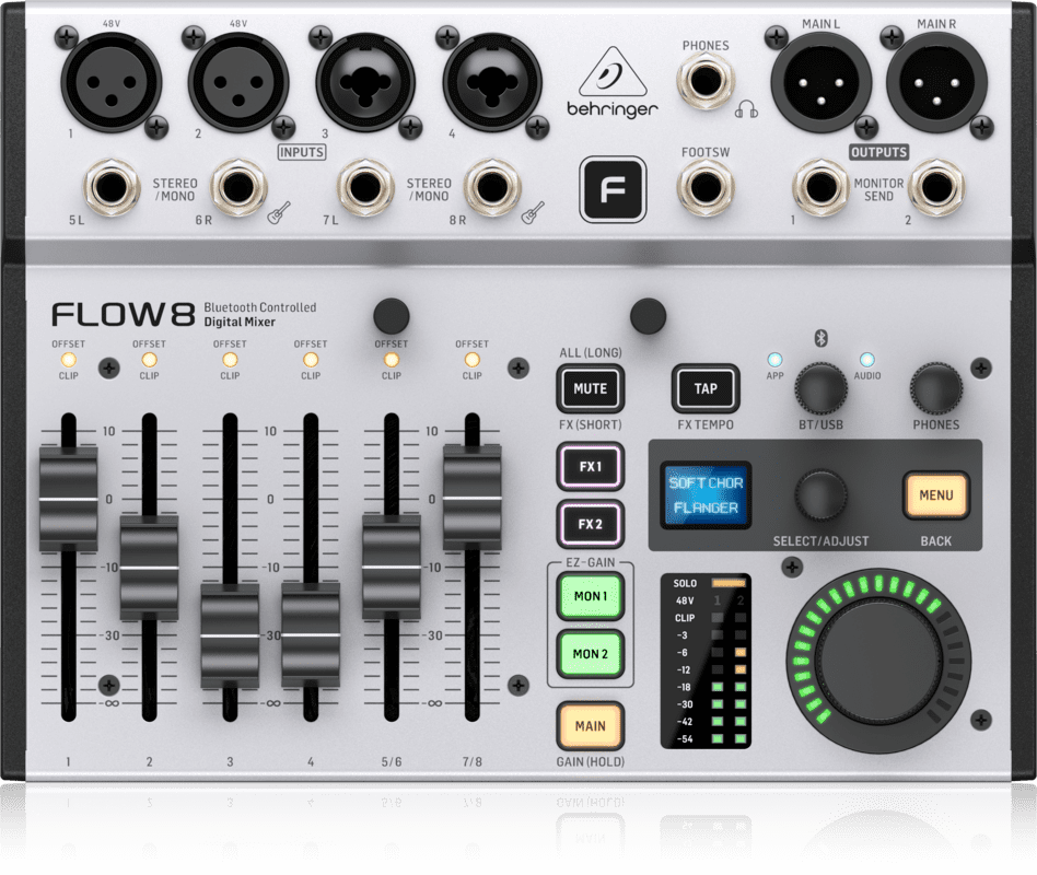 BEHRINGER FLOW 8 is a digital mixer with 8-channel Bluetooth functionality with the possibility of wireless control through a dedicated FLOW app. It has 2 microphone inputs via XLR with MIDAS preamplifiers and +48v phantom power, 2 Combo XLR/TRS mic/line inputs, 2 pairs of stereo line inputs balanced via 1/4" TRS jack, 2 FX sends, 2 monitor outputs and headphone output. All channels have 4-band Eq with integrated compressor and through the 2 keys of the FX1/FX2 effect engines, it is possible to select up to 16 studio effect presets per engine. The mixer is equipped with a 10x2 channel USB audio interface with a resolution of 48 kHz/24 bit, and in EZ-Gain mode it is possible to monitor and adjust the signals on each channel for optimal