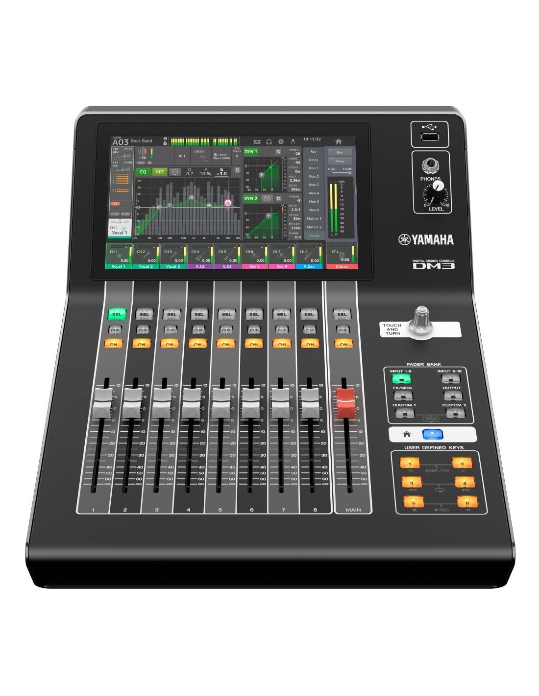 YAMAHA DM3S. Compact 16-channel digital mixer with 9 motorized faders, 9" touchscreen with single Touch & Turn encoder to handle most operations. Technical features include 16 Mic/Line Inputs including 12 Mono Inputs via XLR, 4 Inputs via microphone preamp on XLR/TRS combo connector, 1 stereo input + 2 FX return, Bus: 1 Stereo, 6 Mix, 2 FX, 2 Matrix, 8 XLR outputs, 8 DCA groups with Roll-out, 18 Effects and GEQ