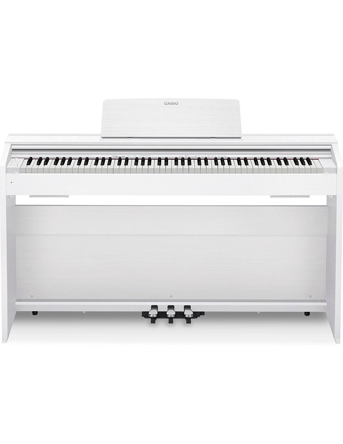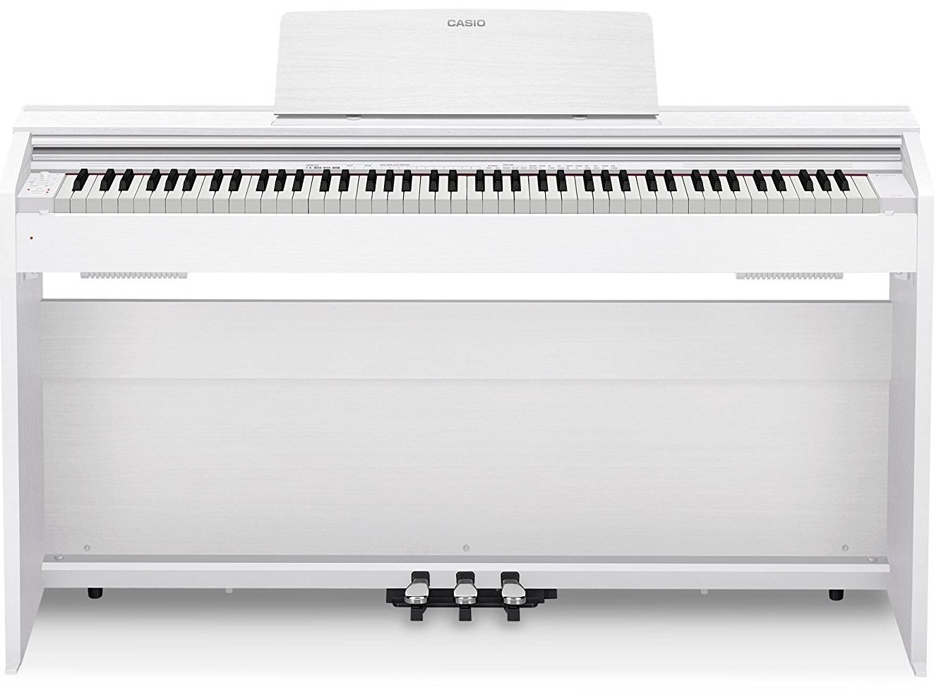 The PX-770 WE is a Casio digital piano in white color, with 88 weighted keys. It is equipped with a scaled hammer mechanism with three sensors and a key cover that recalls those of real ebony and ivory grand pianos