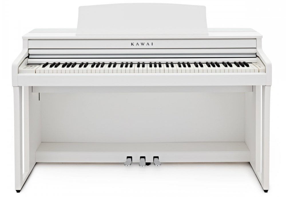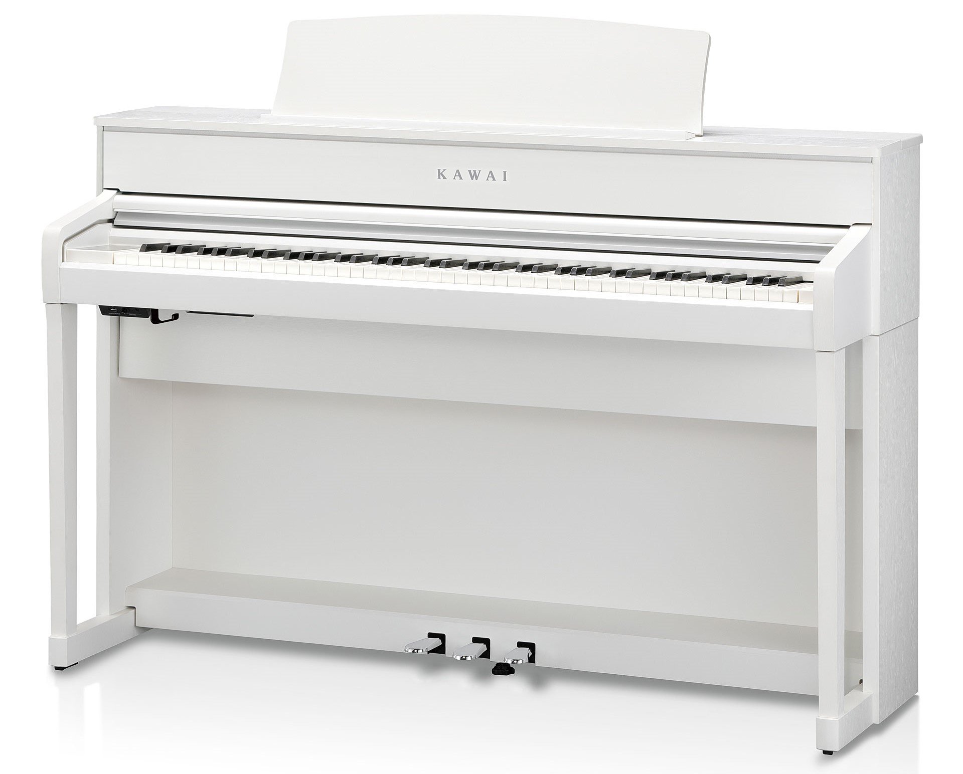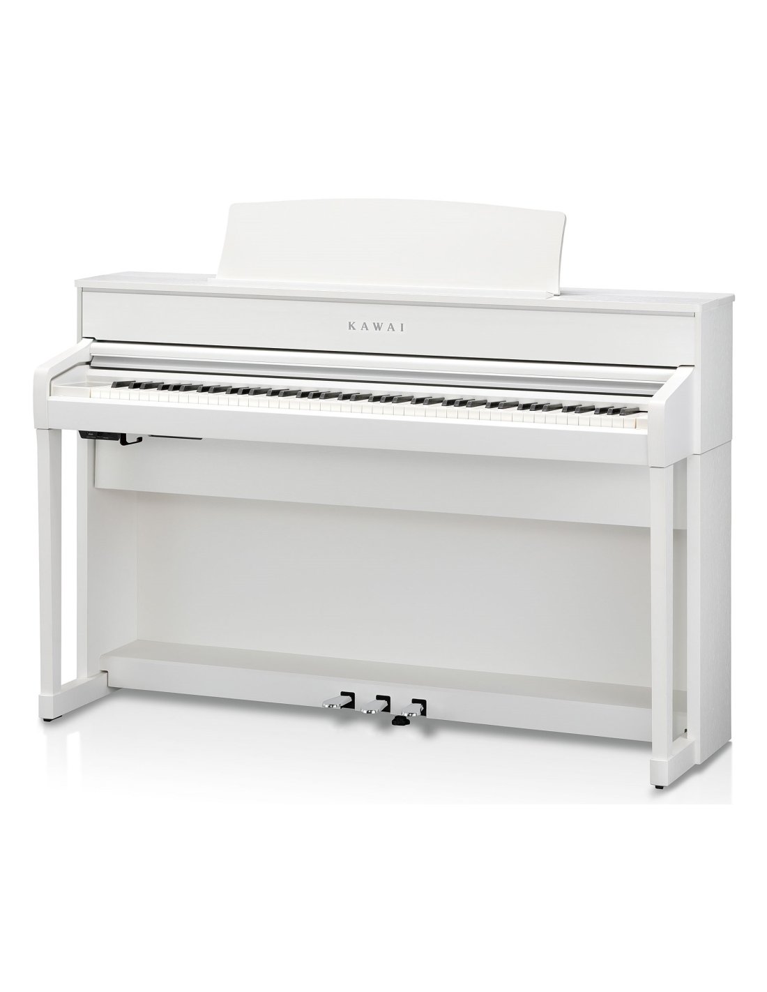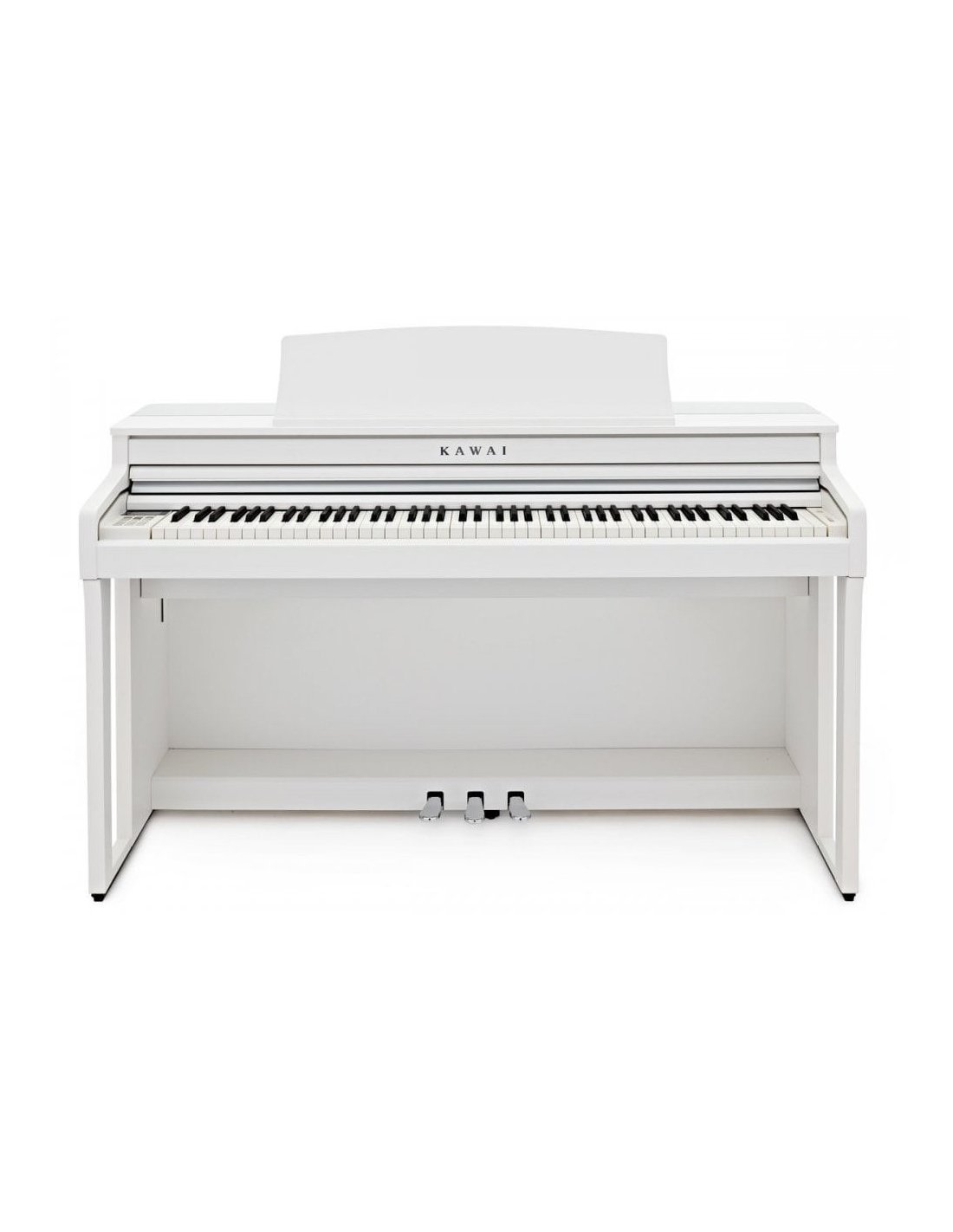 The CA701W is a Kawai digital piano in white color, with 88 weighted keys. It is equipped with a scaled hammer mechanism with three sensors and a smooth but not slippery Ebony and Ivory Touch key cover, reminiscent of quality acoustic pianos