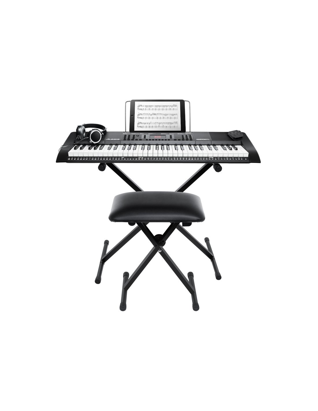 Keyboard with 61 piano-style keys, built-in speakers and 300 built-in quality sounds that cover a wide range of instruments: pianos, strings, brass, wood, percussion, mallets, guitars, synthesizers, and sound effects. “Dual” and “Split” modes. 40 demo songs and 300 backing rhythms. Record your songs using the 'Record' mode. It includes an easy-to-assemble X-stand, a bench with three height settings, a headphone, a sustain pedal, a lectern to hold the sheet music and a power adapter