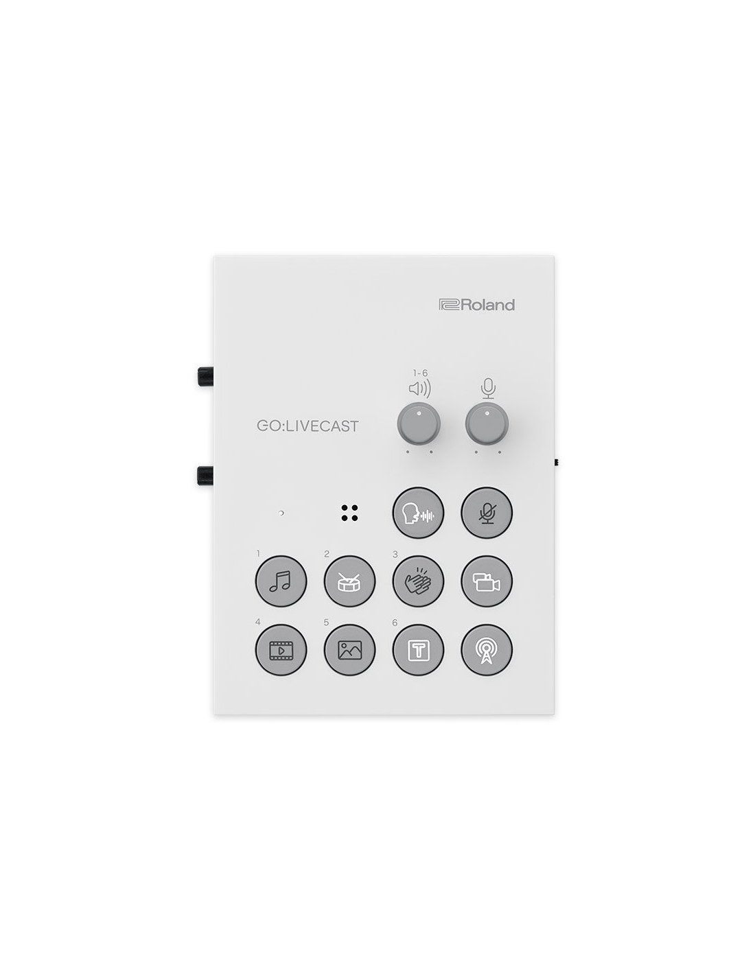 ROLAND GO LIVECAST. Audio/video streaming controller for smartphones compatible with Twitch, Facebook Live, YouTube. Technical features include XLR/TRS combo microphone input with +48v phantom power, headphone input,