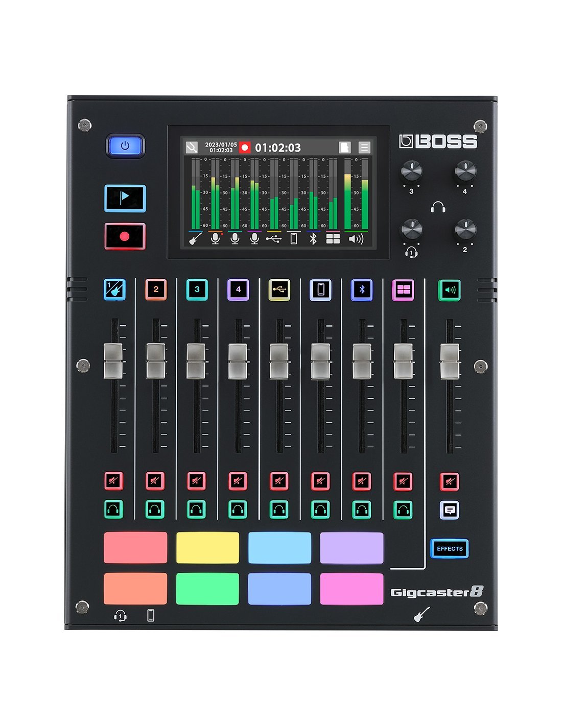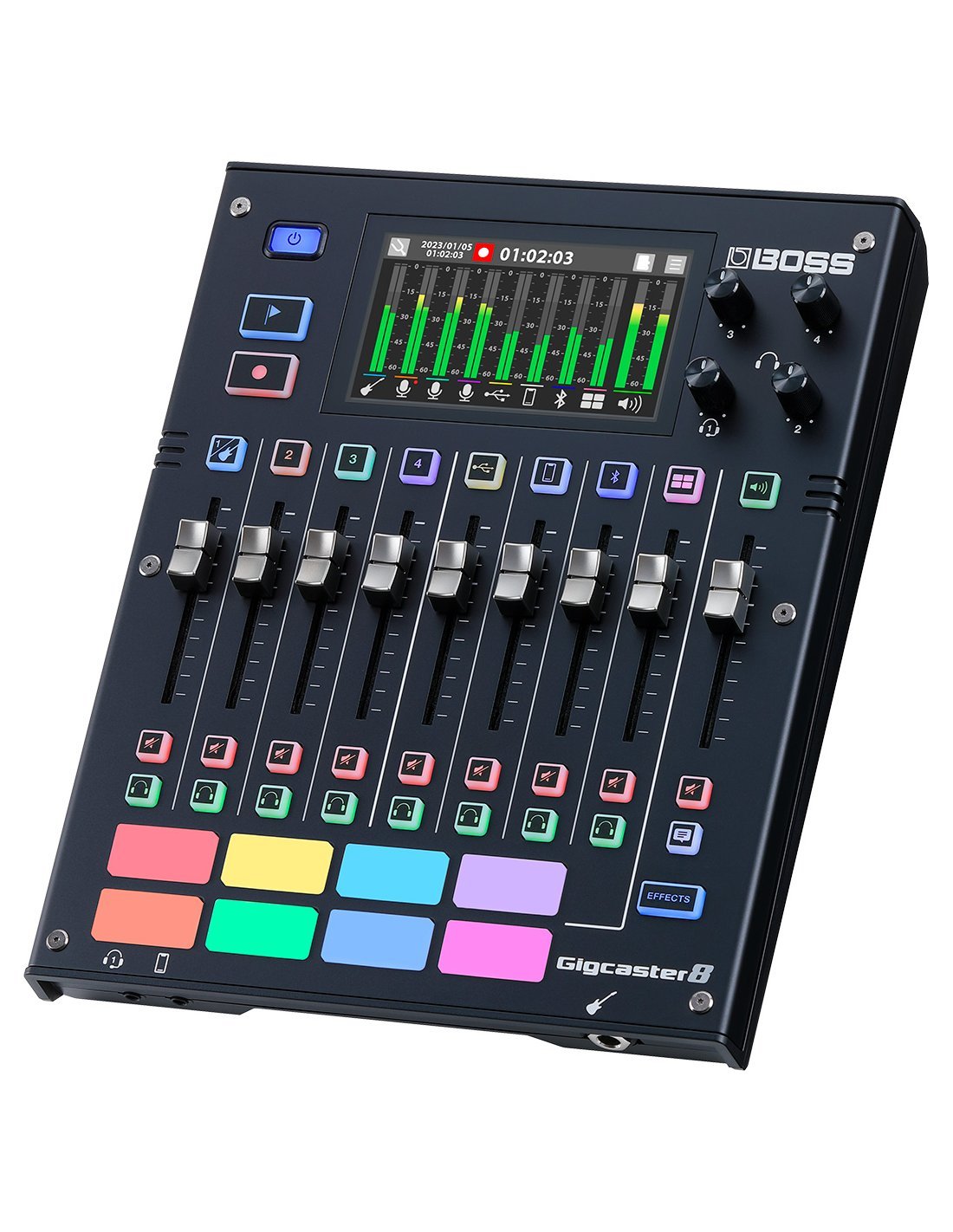 BOSS GCS-8 GIGCASTER8 is a USB audio interface for streaming with an integrated 8-channel mixer. Technical features include 32-bit floating point processing and 48kHz sampling rate, 8-channel mixer with faders, backlit keys, high-impedance inputs for direct connection of musical instruments, 4 microphone combo inputs with high-quality phantom power and preamp, suite of Boss amplifiers and effects derived from the GT-1000, VE voice processors for harmonyzer and vocal transformer functions, 4.3" touchscreen displays, 8 backlit and customizable pads, Talkback function, Ducking volume function, 4 headphone outputs with EQ, also works as a 20x14 USB audio interface for