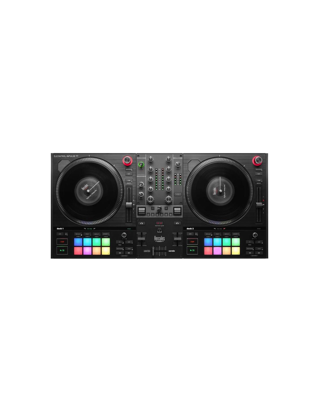 HERCULES DJ CONTROL IMPULSE T7. 2-channel USB DJ controller with 44.1 kHz/24-bit audio interface. Technical features include 2 7" motorized Jog Wheels, 3-band Eq with filter and Gain control on each channel, 16 backlit RGB pads, Loop In/Loop Out buttons, loop encoder, Stems function to create transitions between tracks, Volume Fader, VU meter, Crossfader and VU meter Master. It has 2 XLR + 2 RCA outputs, 1 3.5 and 6.3 mm jack for headphones, 1 6.3 mm jack for microphone. It includes Serato DJ LiTE and DJUCED software