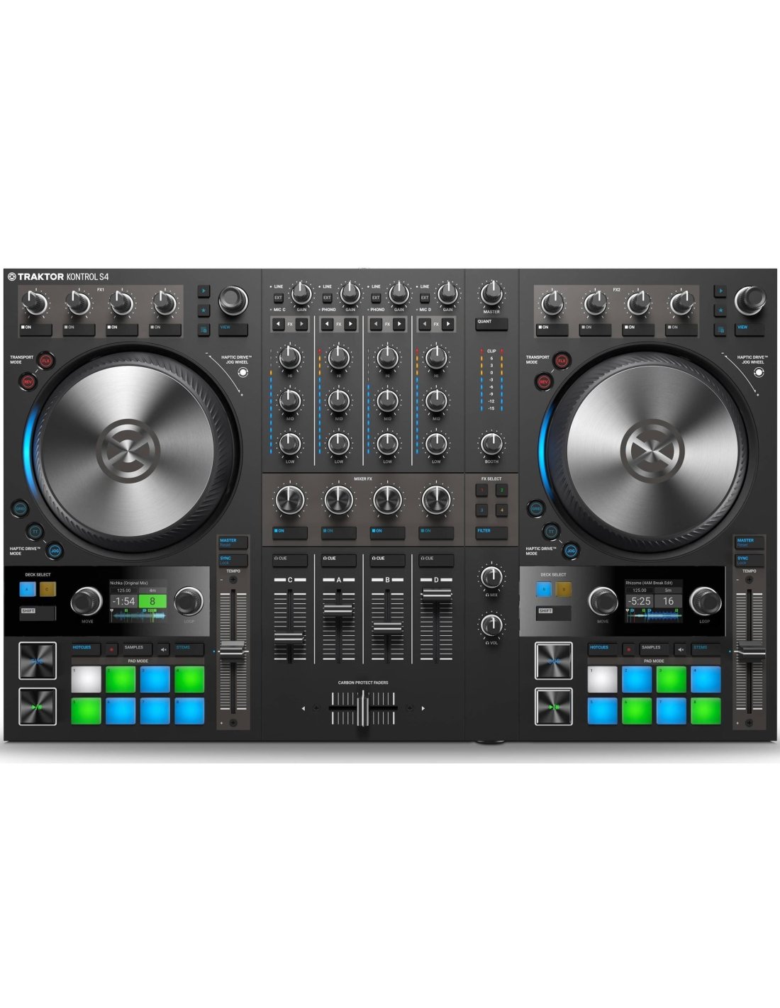 NATIVE INSTRUMENTS TRAKTOR KONTROL S4 MK III is a premium digital DJ system with 4-deck controller and 4-channel audio interface, specifically for use with Native Instruments Traktor Pro 3 software. Technical features include 2x high resolution Jog Wheel with magnetic brake, rubber-coated outer edge and glossy plate, plug-and-play integration with Native Instruments Traktor Pro 3 and for the Traktor DJ iOS app, 4 channels, each with a level fader, 3-band EQ, filter knob, gain control and 4 FX sends, Flux Mode controls, 16 backlit RGB color coded buttons, 4-channel mixer with ergonomic layout, MP3 management with iTunes integration and iPad compatibility, integrated 4-channel audio interface channels with Cirrus-Logic AD/DA converters with 24-bit/96kHz resolution.