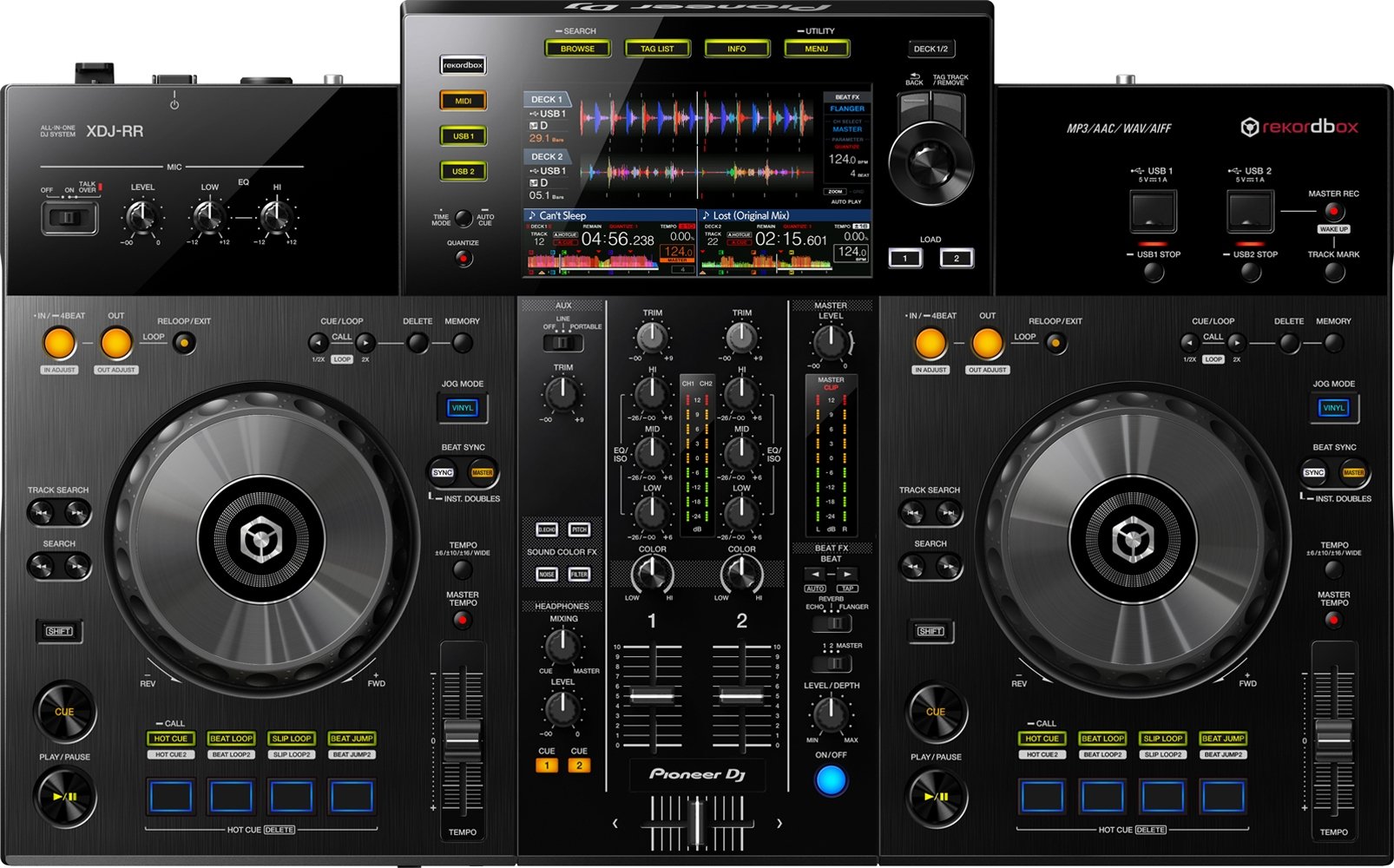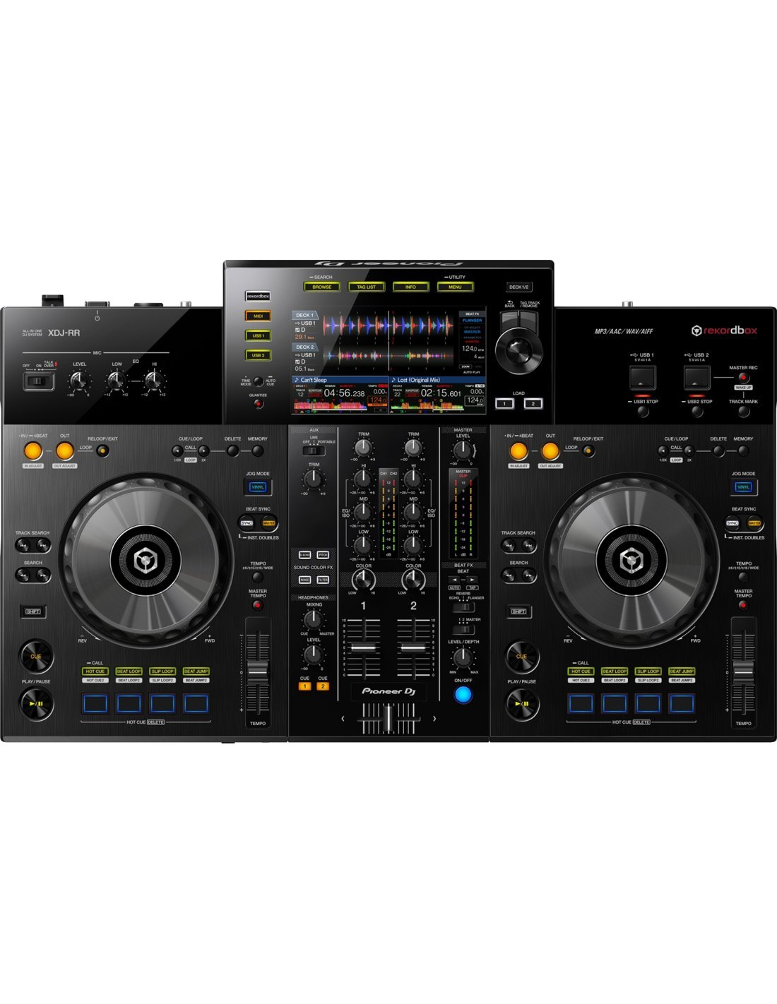 PIONEER DJ XDJ RR. All-in-one USB controller designed for DJs with intuitive 2-virtual deck layout for controlling 2 tracks simultaneously. Technical features include loop, cue, hot cue, beat jump, high-resolution color display, 2 large 7" aluminum Jog Wheels, 4 faders, 2 volume control and 2 tempo functions, integrated 2-channel mixer with three-band EQ (bass, midrange, treble) for each channel, main volume control and headphones, 3-band Eq, Trim and Filter on each deck, Crossfader on each deck, integrated effects such as Sound Color FX, Beat FX, Release FX, Eco, Reverb, Flanger, Filter, Noise, Dub Echo, Pitch. USB and AUX inputs for connecting external devices, XLR and RCA audio outputs for connections to professional audio systems or amplified speakers, and 2 USB ports for connecting computers or USB devices for accessing digital music libraries. The system is compatible with the Pioneer DJ's WeDJ application for managing and controlling tracks via smartphone or tablet and with the Rekordbox Dj software