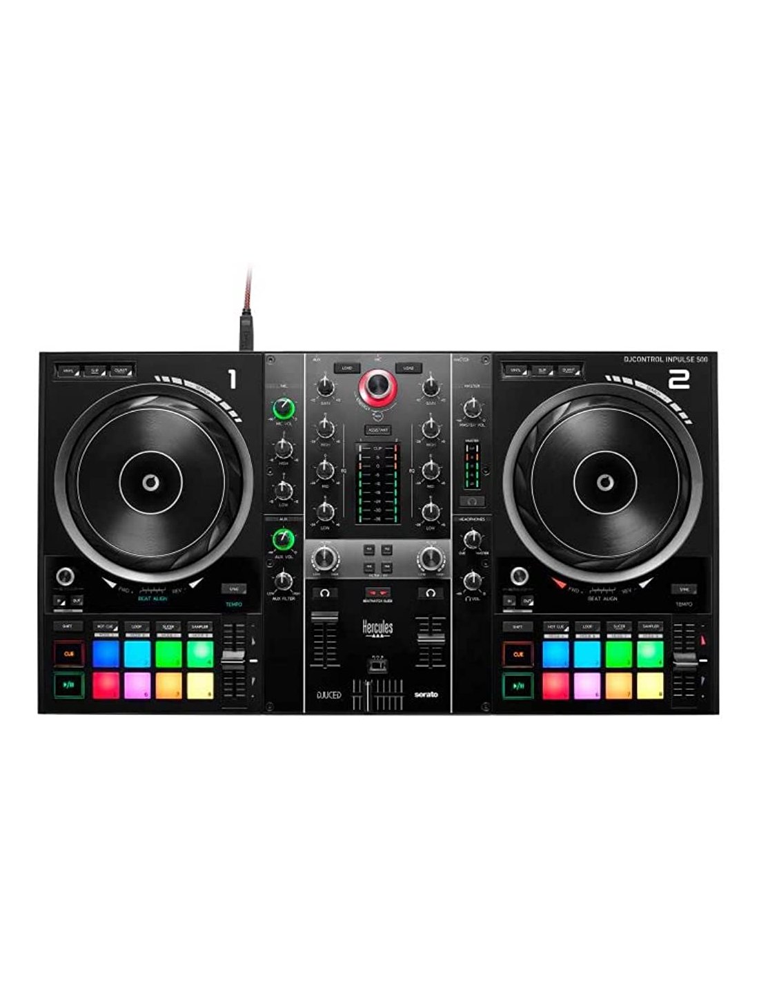Hercules DJControl Inpulse 500 was created for Serato DJ Lite and DJUCED to help you start mixing, it has a professional design with a sturdy protective metal plate and a lot of exceptional features: four extendable/retractable feet to lift your mix, a hardware mixer for audio inputs, a dedicated Filter/FX area with fantastic effects, two large touch-sensitive jog knobs for scratching, 16 RGB rubber pads backlit, useful light guides for mixing in total confidence... and much more. You can even mix using the millions of tracks from streaming music services, including TIDAL and SoundCloud GO+ in Serato DJ Lite, and Beatport LINK, Beatsource LINK and Qobuz in DJUCED. The Filter/FX area allows you to customize your DJ set with the effects available in Serato DJ Lite and DJUCED. You can even combine the filter action with an effect, in DJUCED. The AUX Filter knob allows you to add a filter effect to an external audio source (smartphone, media player) regardless of the software. With its feet open, the DJControl Inpulse 500 is 8 cm tall. You can run the cables underneath and it protects the controller from spilled drinks. With open feet (i.e. extended), the base is backlit. Powered by USB, the DJControl Inpulse 500 has the master outputs you need to connect your speakers (2 6.35mm jacks + 2 RCA), as well as two headphone connectors (3.5mm stereo mini-jack + 6.35mm stereo jack). It's easy to manually mix one track with another, thanks to the BEATMATCH GUIDE light guides, supported in both DJUCED and Serato DJ Lite. Connect your microphone to the balanced input and adjust your voice using the High EQ and Low EQ knobs, so you can hear it distinctly while you're performing. DJUCED's Intelligent Music Assistant (IMA) suggests the most suitable tracks to queue up, selecting them from your music library, as well as from Beatport LINK, Beatsource LINK. Activate the Assistant to start the Autoplay function in Serato DJ Lite. You can easily adjust the width of the crossfader to suit the style of your music. Use the curve switch function to change the crossfader curve directly from the controller (mix, scratch or off) |