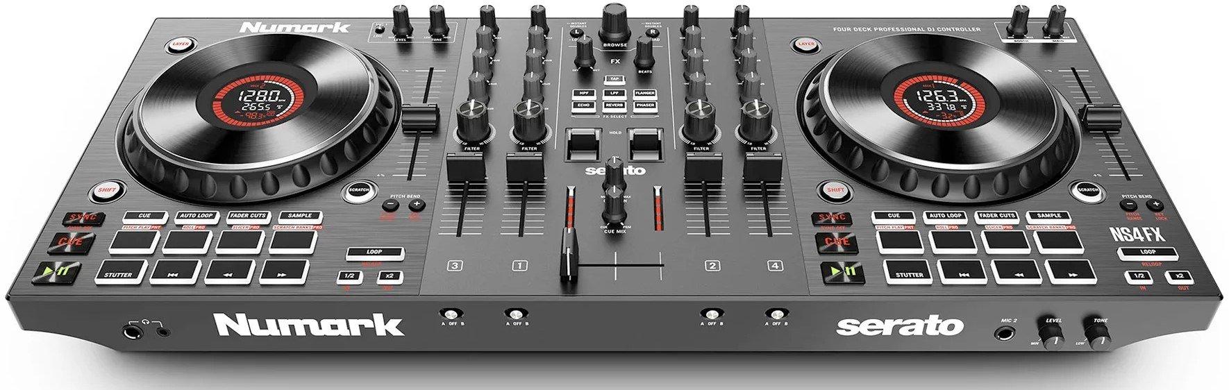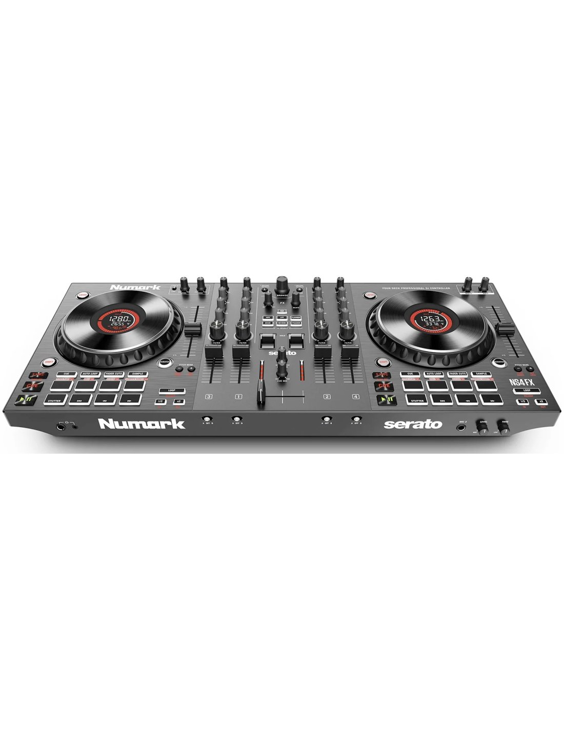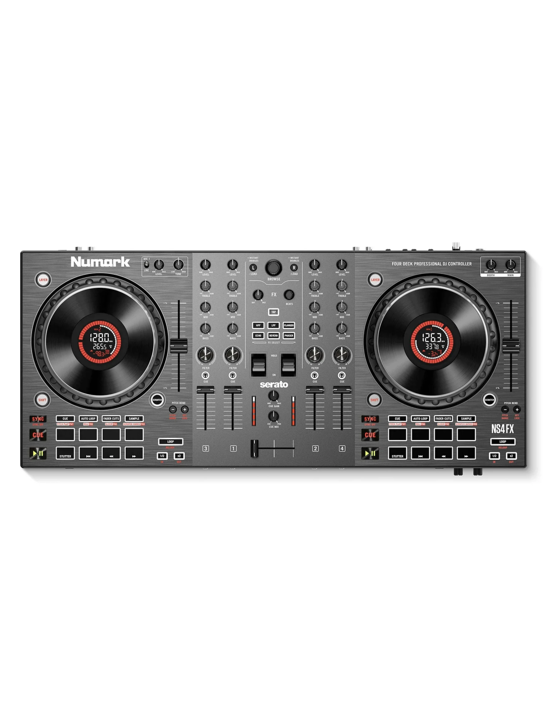 NUMARK NS4FX DJ CONTROLLER 4 CH. 2-deck, 4-channel DJ controller with 24-bit digital audio interface. The technical features include 2 large 6" capacitive touch Jog Wheels with interactive color display, faders on each channel, 3-band equalizer with full kill and large high/low pass filter knobs, Crossfader assignment switch, 16 multifunctional and backlit performance pads, layer button to control up to 4 software decks, effects section with 6 keys and parameter control as well as two toggle switches, dedicated loop section with multiple controls, sync, cue/stop, play/pause. It features balanced XLR master output, unbalanced booth output, headphone jack and mini jack output with fading pre-listening, general master and USB-B port for connecting to an external computer. It works with Serato software and comes with the Serato DJ Lite pack