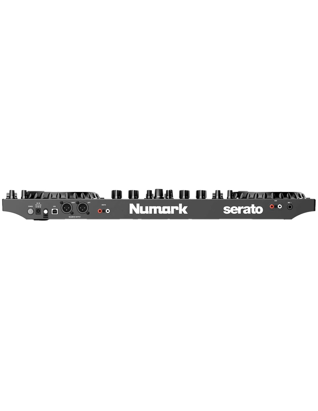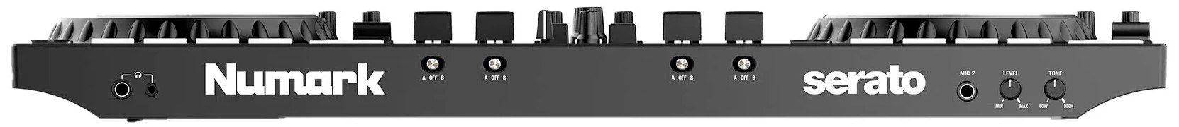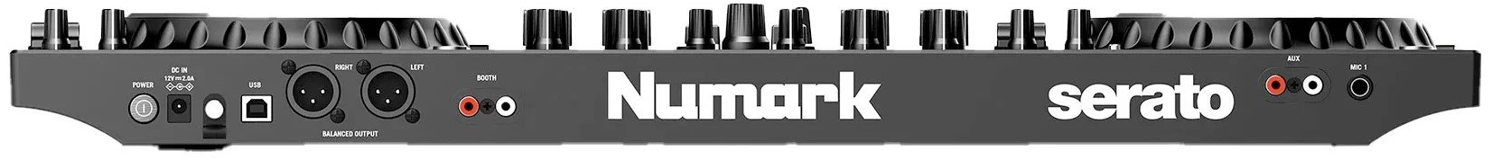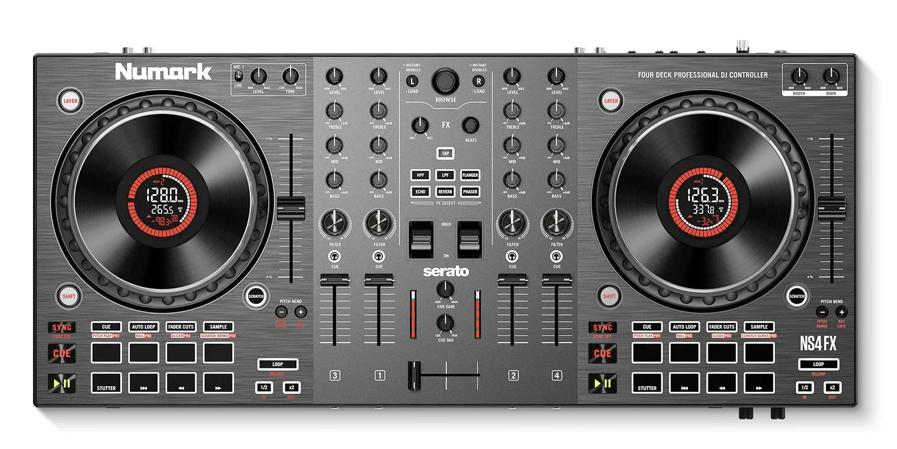 NUMARK NS4FX DJ CONTROLLER 4 CH. 2-deck, 4-channel DJ controller with 24-bit digital audio interface. The technical features include 2 large 6" capacitive touch Jog Wheels with interactive color display, faders on each channel, 3-band equalizer with full kill and large high/low pass filter knobs, Crossfader assignment switch, 16 multifunctional and backlit performance pads, layer button to control up to 4 software decks, effects section with 6 keys and parameter control as well as two toggle switches, dedicated loop section with multiple controls, sync, cue/stop, play/pause. It features balanced XLR master output, unbalanced booth output, headphone jack and mini jack output with fading pre-listening, general master and USB-B port for connecting to an external computer. It works with Serato software and comes with the Serato DJ Lite pack