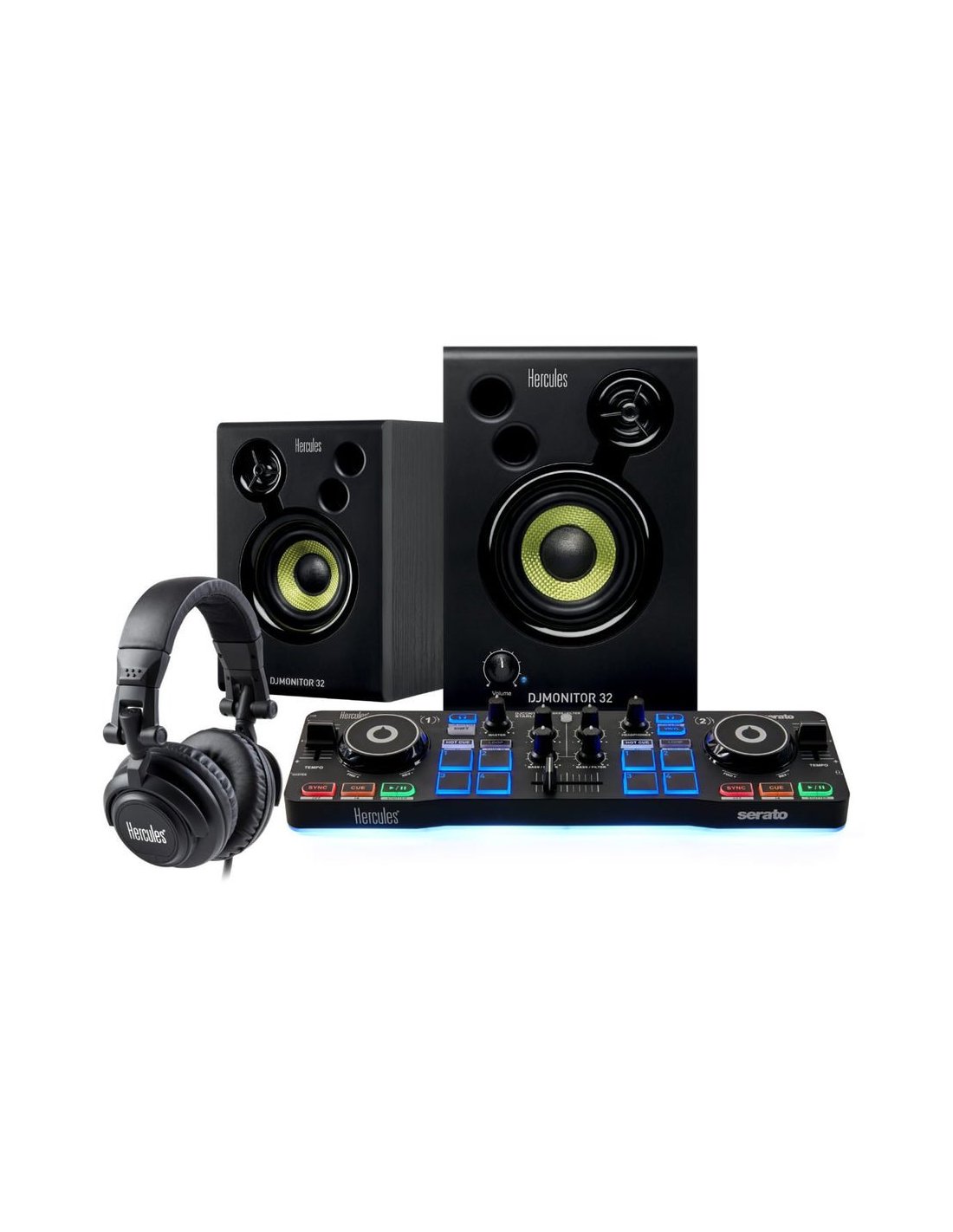 HERCULES DJ STARTER KIT. DJ starter kit that includes 2 Hercules DJMonitor 32 monitors, Hercules DJControl Starlight digital USB controller and Hercules HDP DJ M40.2 closed headphones.