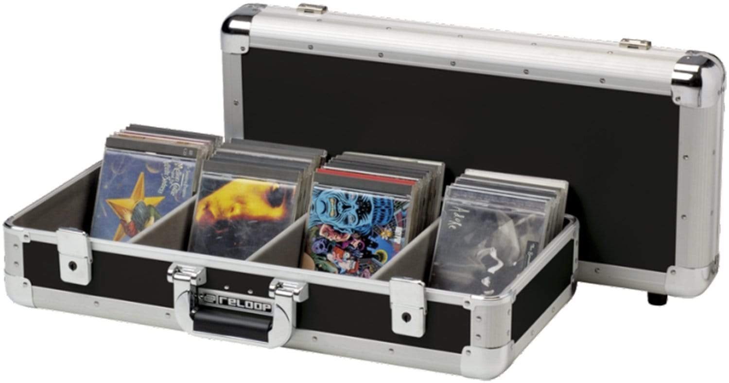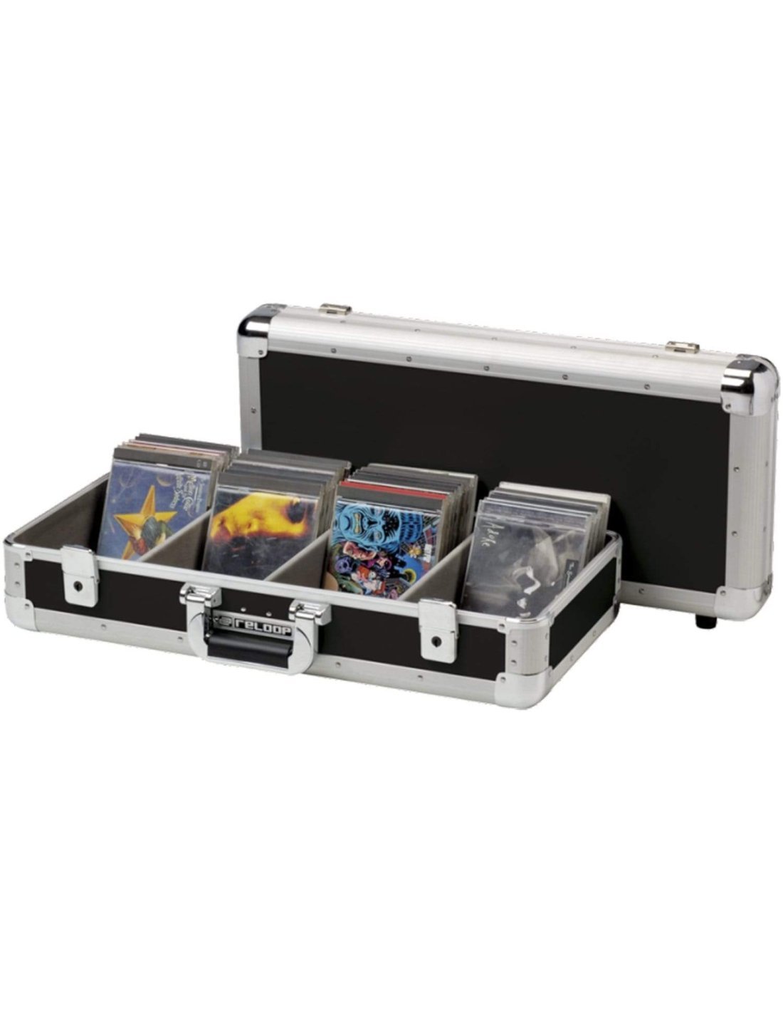 RELOOP 100 CD CASE BLACK. CD case made of aluminium-coated plywood, capable of holding 100 CDs in 4 internal compartments. Equipped with a handle, snap locks with key, and internal padding