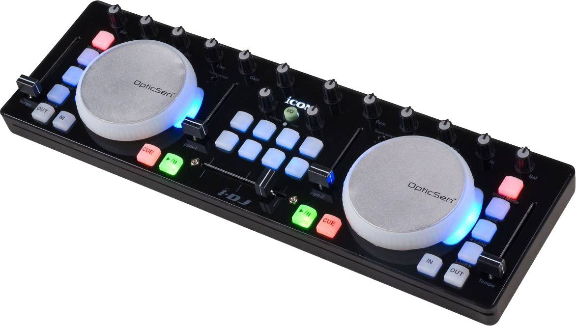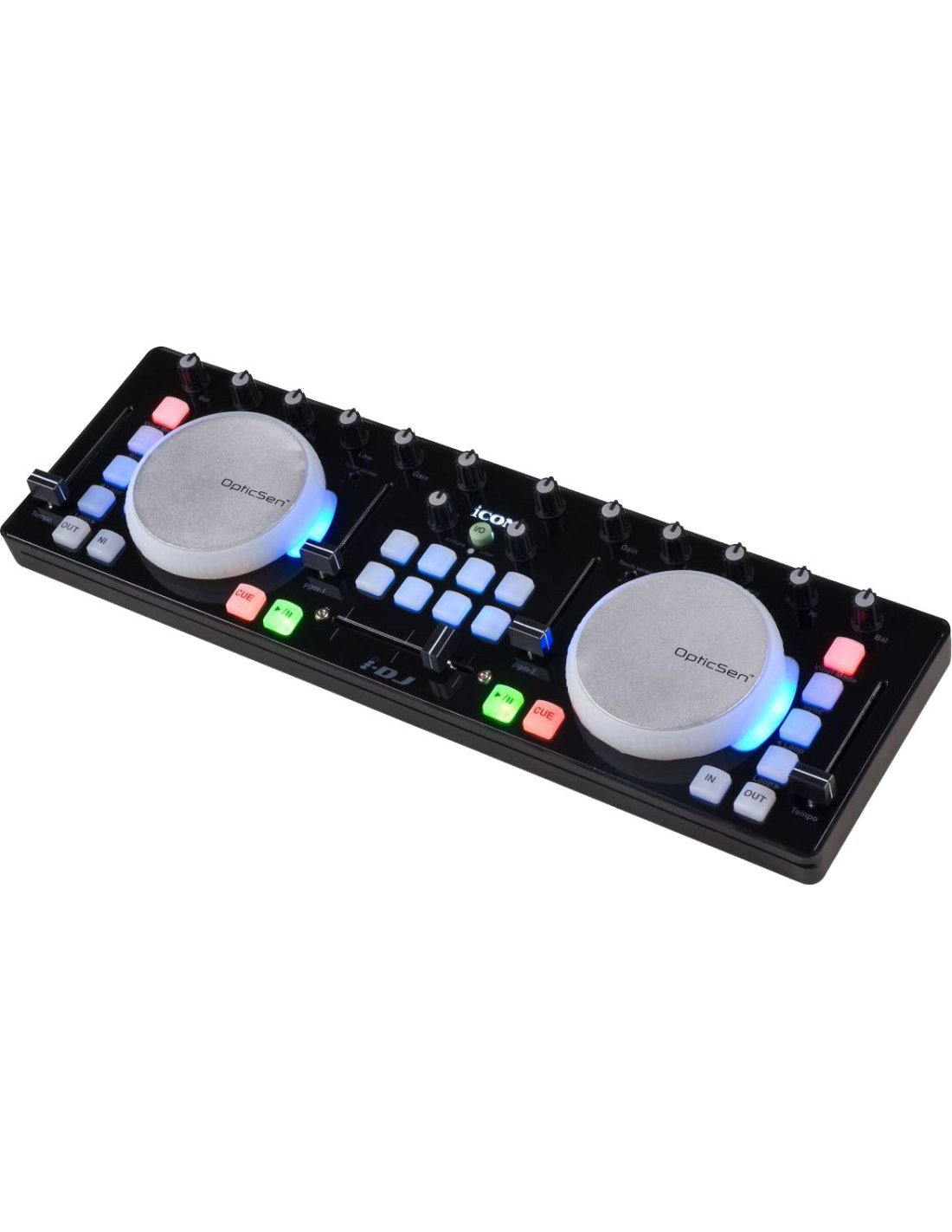 The I-DJ BLACK is a USB-powered iCON DJ controller that offers 8 reconfigurable backlit potentiometers, Vinyl Mode, Sync, Loop, Out, In and Cue, potentiometers for EQ, Balance and Gain, cross-faders, vertical faders for volume and tempo, scratch wheels with adjustable sensitivity and iMap TM software for MIDI mapping.