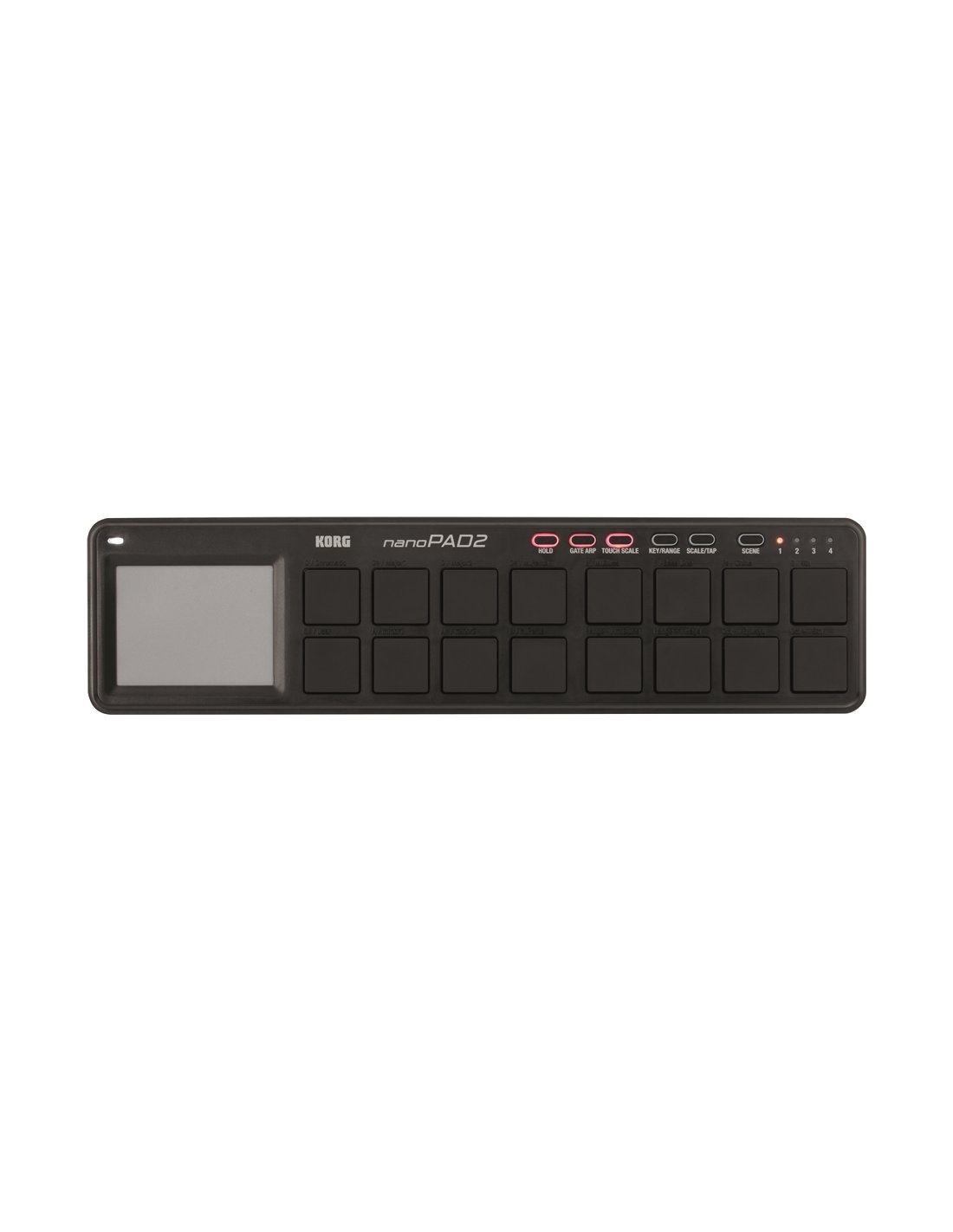 KORG NANOPAD2-BK CONTROLLER is a USB/MIDI controller for music production and live performances, which offers a wide range of controls for managing software parameters. Technical features include 16 dynamic-sensitive pads for triggering sounds, notes and chords, Touchpad X-Y for controlling MIDI functionality, HOLD, GATE ARP, TOUCH SCALE, KEY/RANGE, SCALE/ARP buttons. It includes KORG Kontrol Editor for detailed customization of controls and is pre-mapped for major DAW software such as Ableton Live, Cubase,