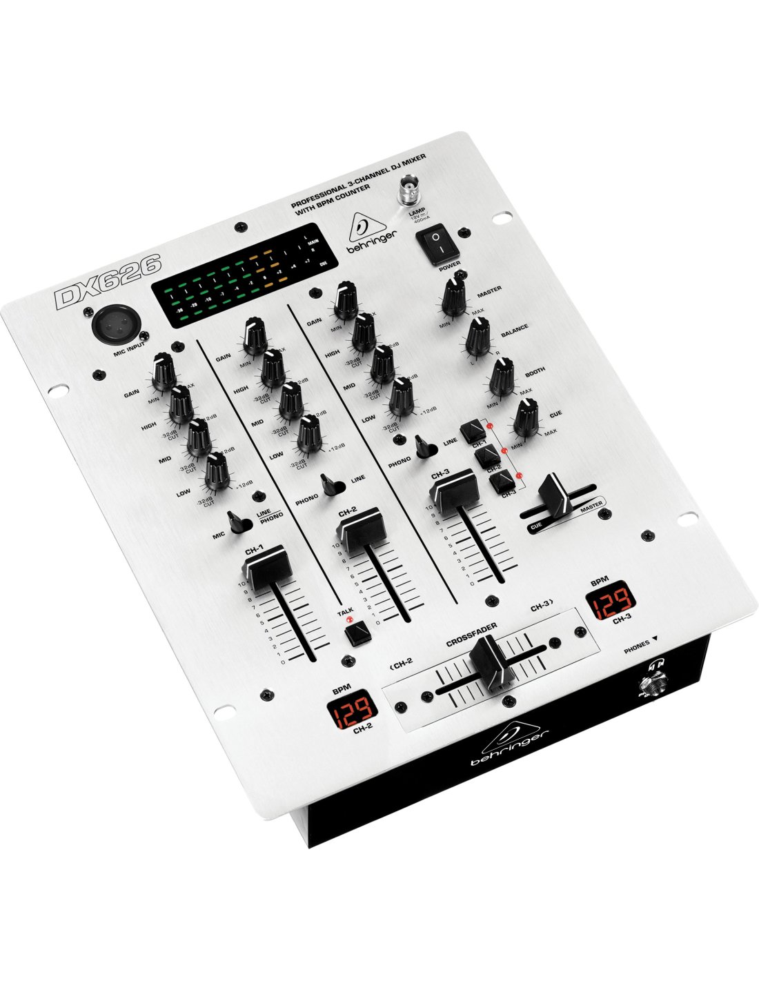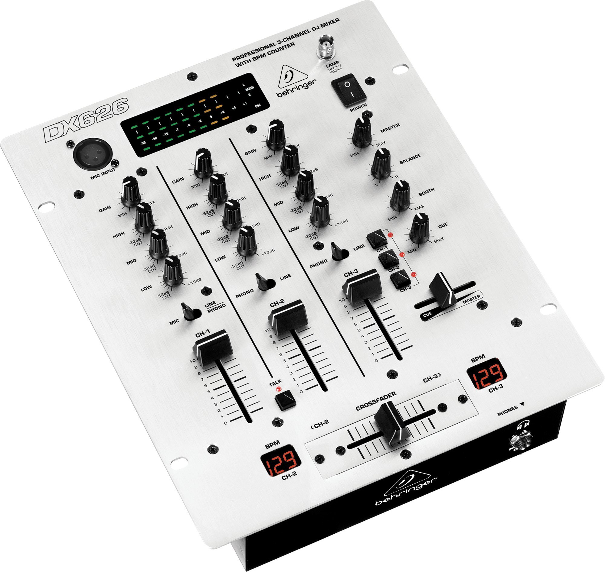 The Behringer DX626 is a 3-channel DJ mixer with dual BPM counter, ultraglide fader (up to 500,000 cycles), VCA-controlled crossafader, 3-band kill EQ and Gain control on each channel, manual Talkover function, microphone input with ULN technology, Monitor function with master/PFL mix option, peak hold level meter with dedicated PFL bar graph and BNC gooseneck Lamp socket.