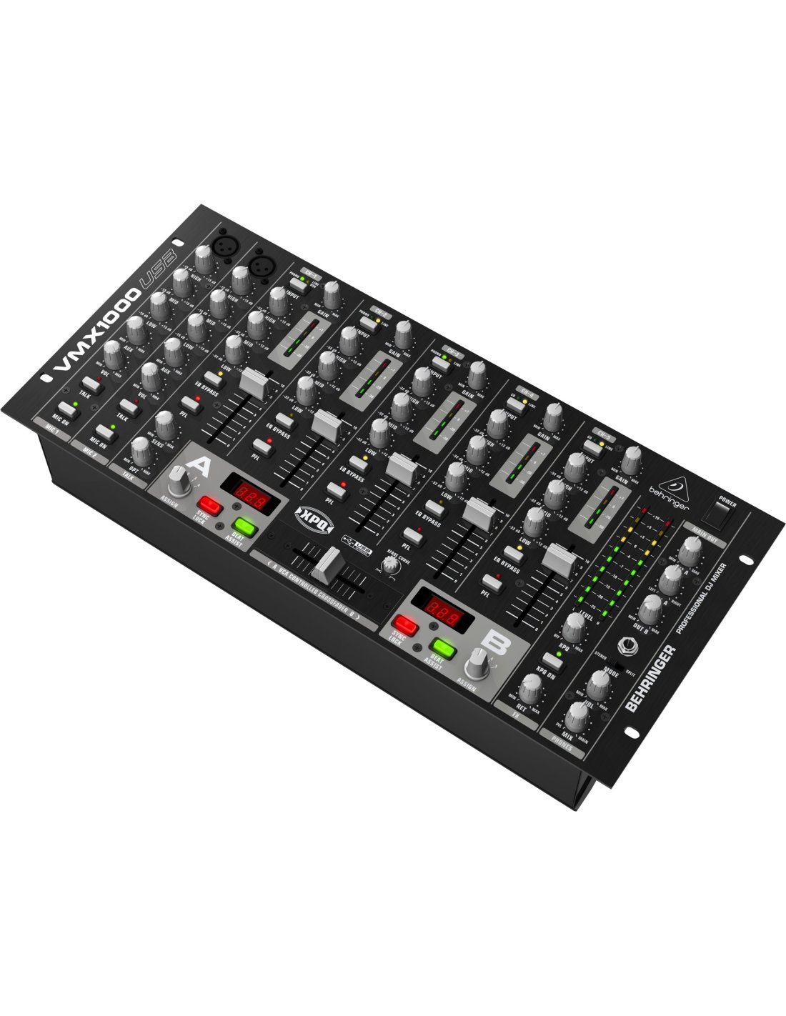 The Behringer VMX1000USB is a 7-channel DJ mixer with dual BPM counter, ultraglide fader (up to 500,000 cycles), VCA control and adjustable curve on the crossfader, integrated USB interface compatible with both Mac and PC without the need for settings or drivers, XPQ stereo surround effect, 3-band kill EQ with on/off switch on stereo channels, Gain control and LED level indicator with 4 segments on each channel, Monitor function with PFL/Main balance and Split option and automatic talkover function. The VMX1000USB has 3 Line/Phono RCA inputs, 2 CD/Line RCA inputs, 1 FX send from the PFL to RCA, 1 FX return to the Main on RCA, 1 Main XLR L/R output, 1 Main 2 RCA output, 1 XLR subwoofer output, 1 Record RCA output