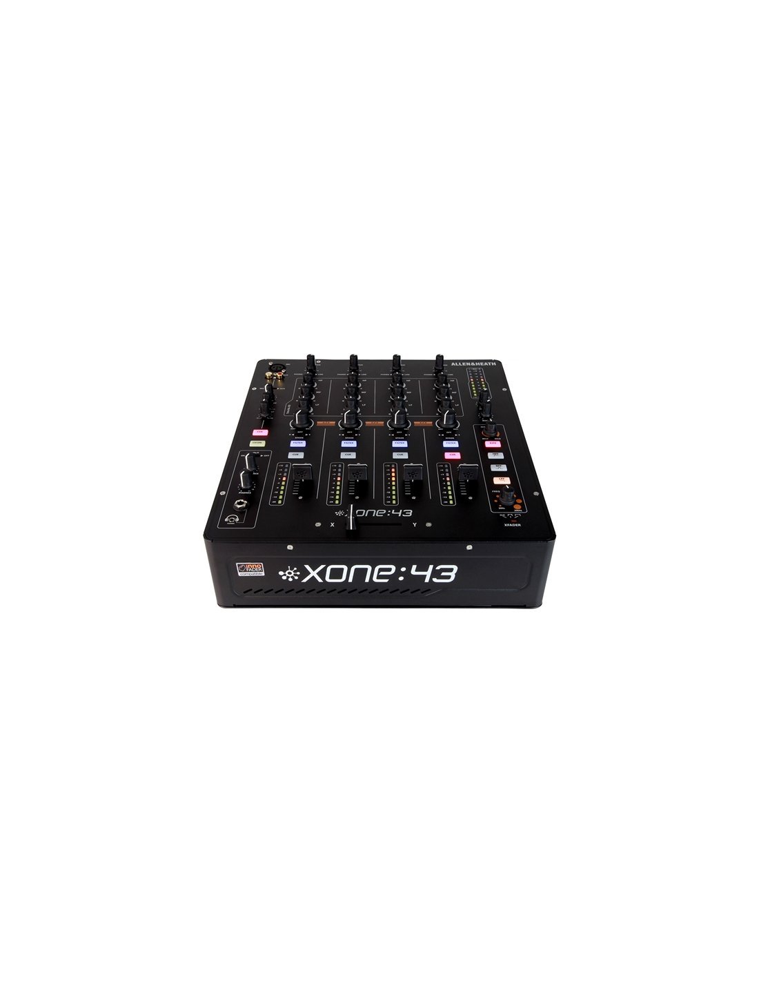 ALLEN & HEATH XONE 43 is a 4+1 channel analog mixer for DJs. Technical features include 4 channels with phono/line inputs selectable via switch, 1 mic/aux channel via XLR and stereo RCA, 3-band equalizer on each channel, VCA fader, crossfader with 3 cut settings, analog VCF filter with frequency control and 3 modes: high pass (HPF), low pass (LPF) and band pass (BPF), headphone section with 2 Jack 1/4 and 1/8 inputs, with volume control and mix. It has Main L/R output via XLR, Booth and Record outputs via