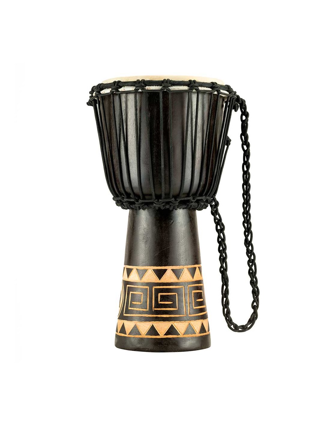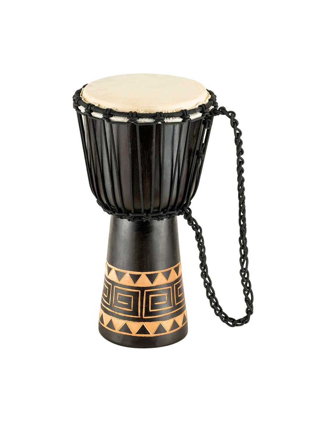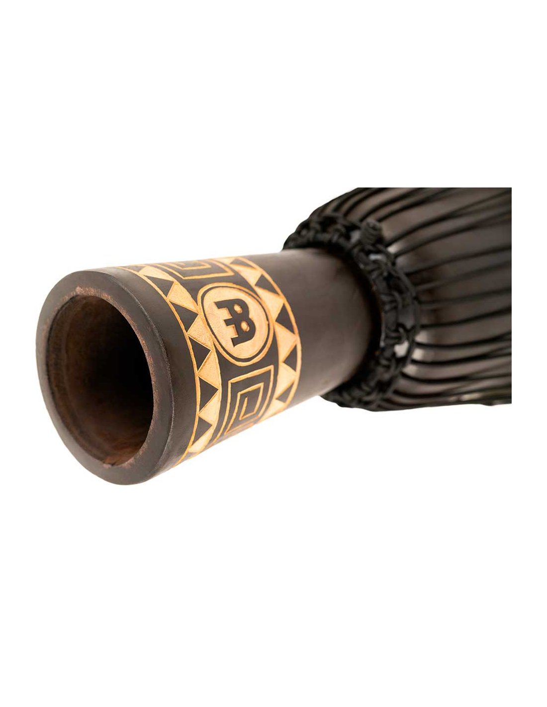 'Wooden djembe measures 8”. Equipped with hand-selected goatskin heads and nylon strings for optimal tuning. The beautiful djembes from the Meinl Headliner series stand out for their traditional and exotic graphics. 100% meticulously handcrafted according to Meinl's high quality standards.