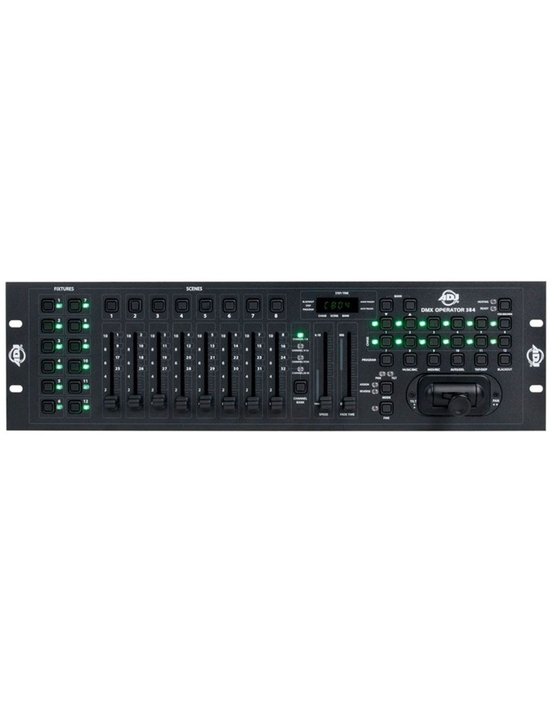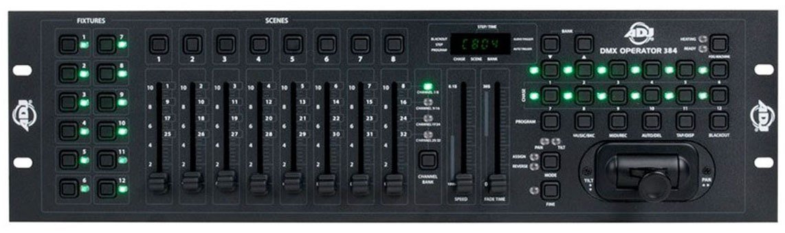 The AMERICAN DJ DMX OPERATOR 384 LIGHT CONTROLLER is a rackmount DMX/MIDI controller capable of controlling up to 384 channels, 30 memory banks for a total of 240 programmable scenes, 12 programmable Chases, 8 faders, USB input, built-in microphone and LCD display. MIDI and RCA (music) inputs, DMX polarity selector, Tap Sync button for setting the effects speed, Fog Machine management and blackout button.