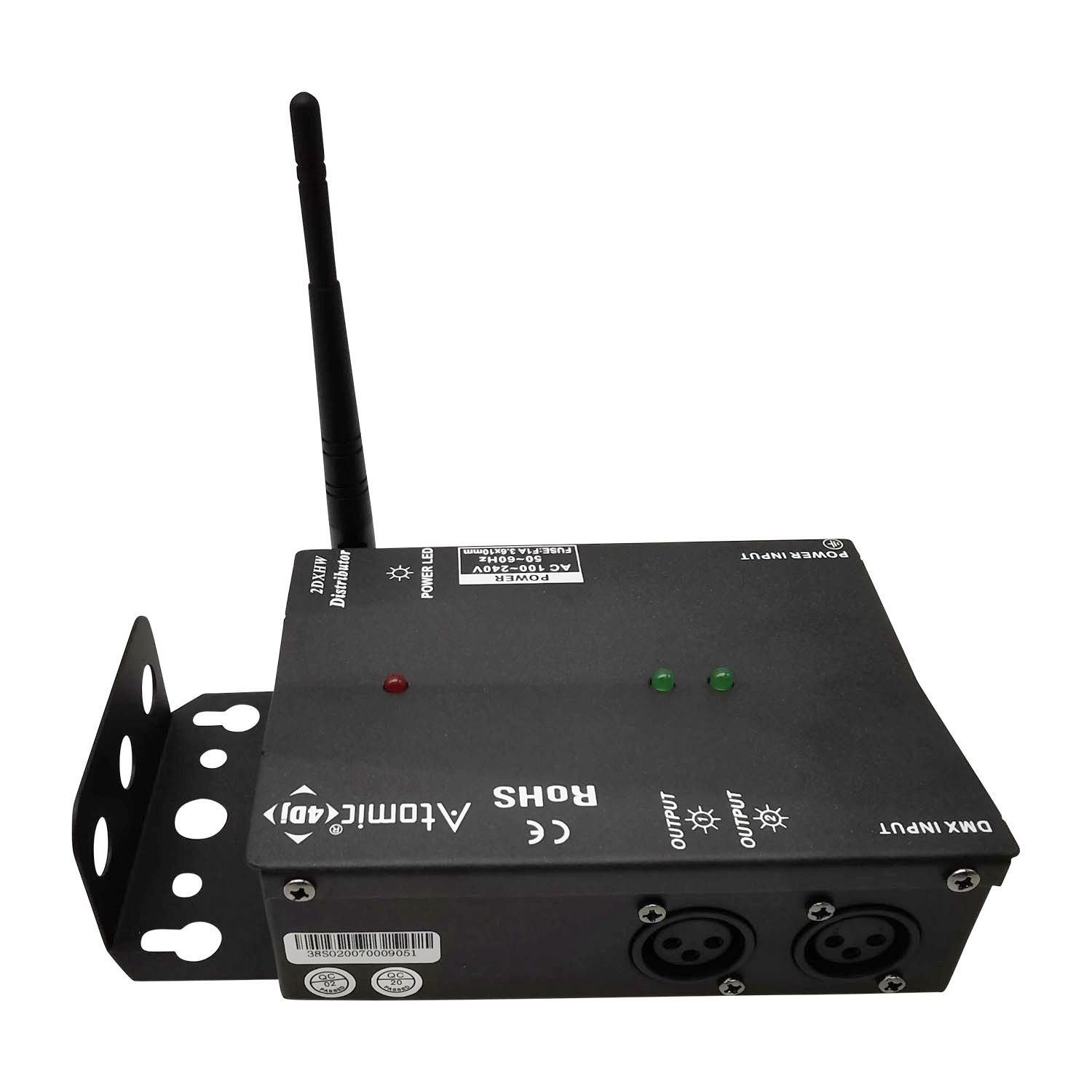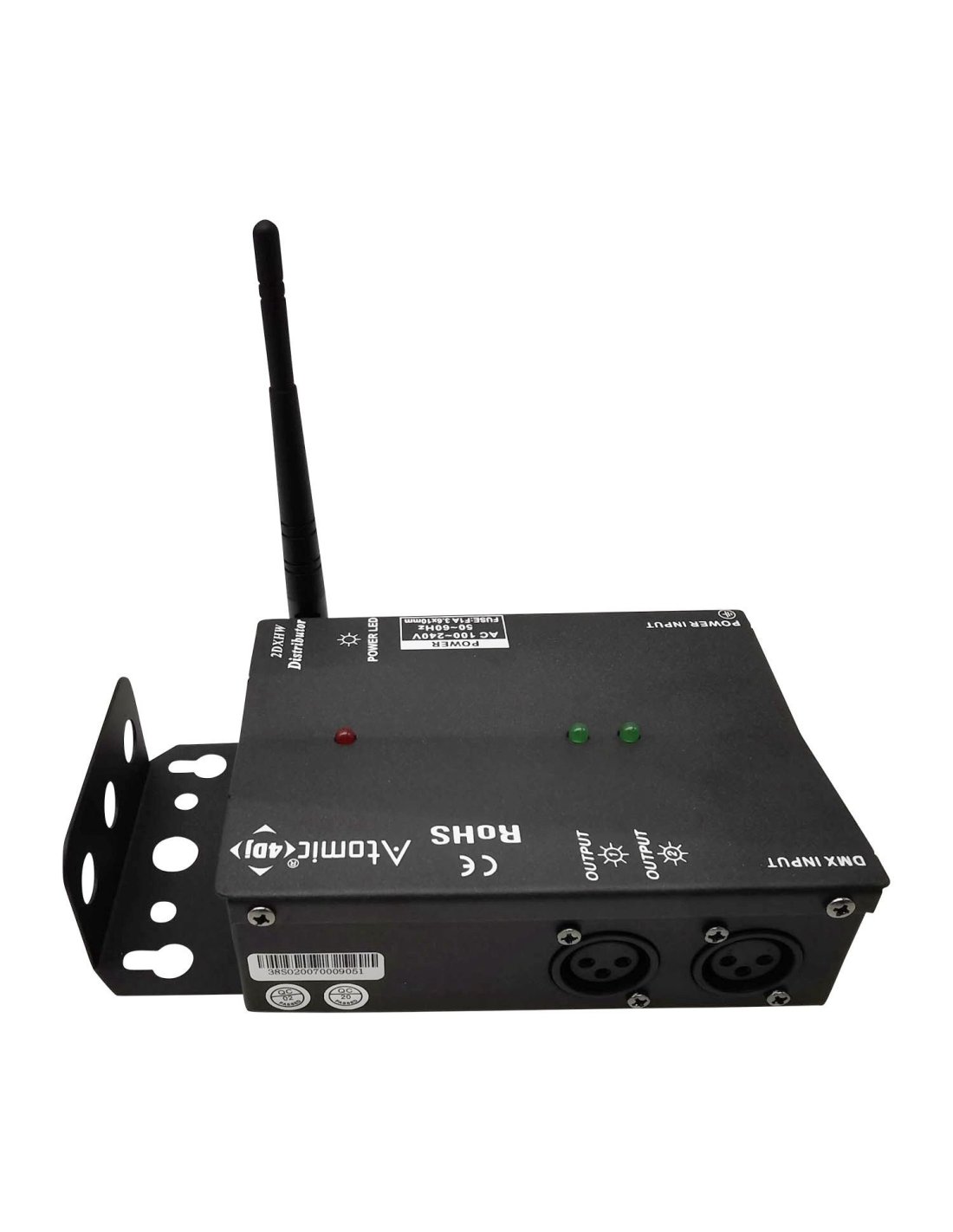 ATOMIC4DJ 2 CH WIRELESS DMX SPLITTER. 2-channel DMX splitter with 2.4 Gz wireless signal transmission on ISM band, 7 ID code groups for wireless correspondence, 3-pin XLR input, 2 3-pin XLR outputs and status indicators on each