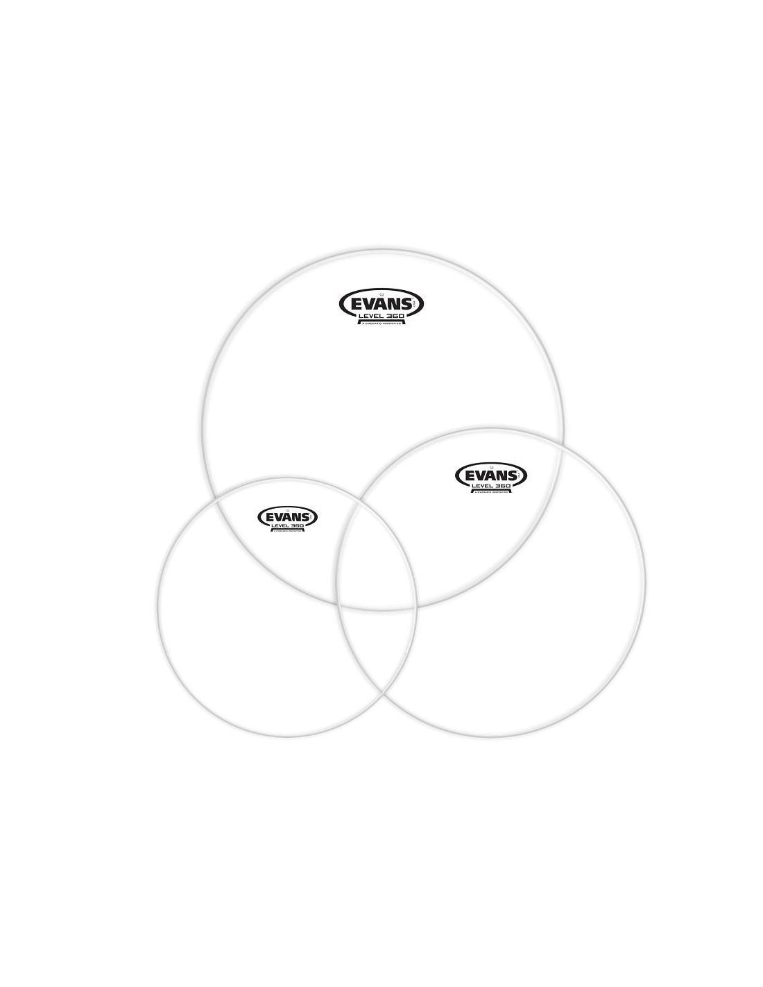 EVANS ETP-G2CLR-F G2 TOM PACK 10/12/14 CLEAR is a kit consisting of 3 Clear skins for Tom Evans G2 series made in a double layer of 0.18 mil films with Evans Level 360 technology. They have a dense and deep sound, with controlled sustain and with maximum durability over time.
