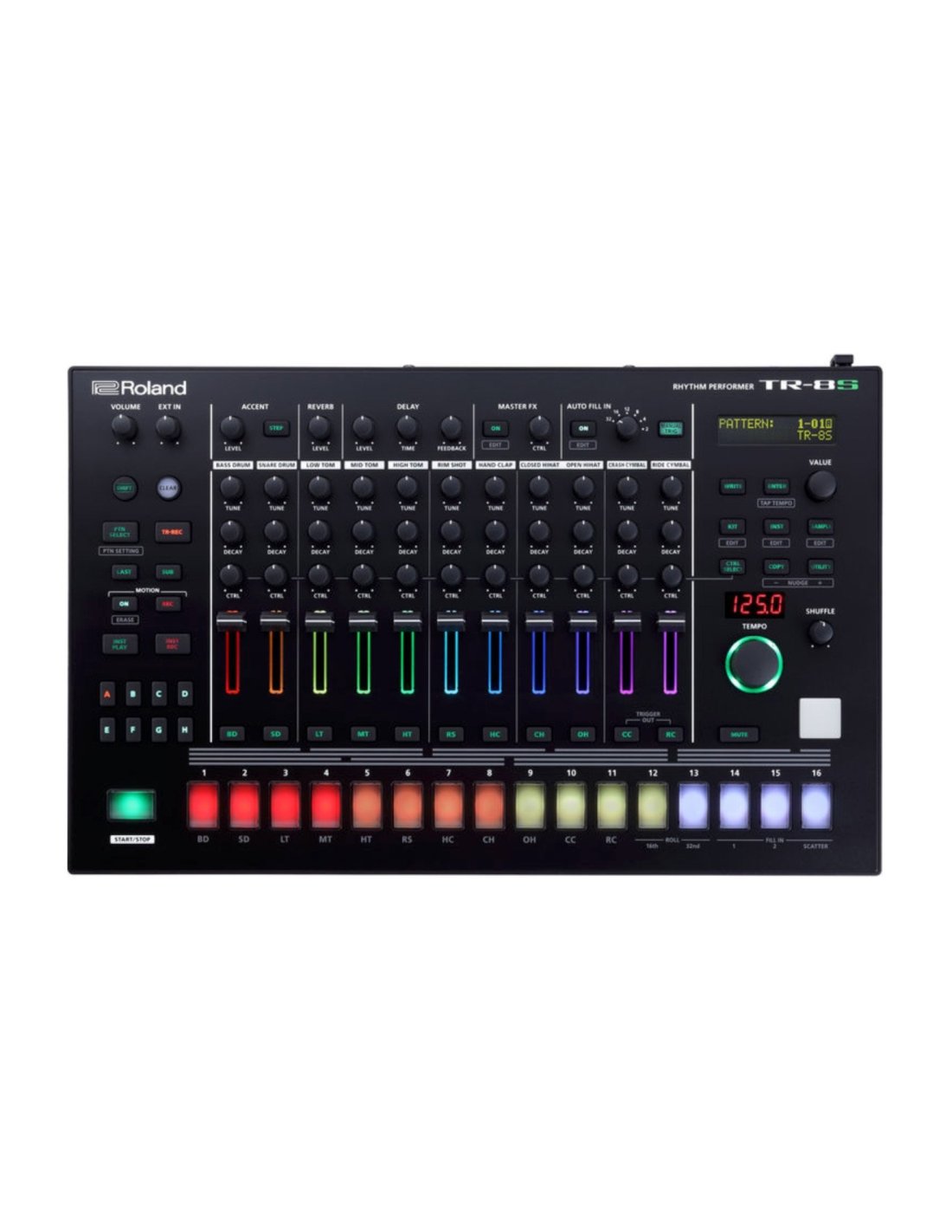 ROLAND TR-8S is a Desktop Drum and Rhytm machine with Sample support, direct control interface and backlit LCD display. Technical features include: analog and digital synthesis technology to emulate classic and modern drum sounds, 16-step sequencer with the possibility of programming complex and variable patterns, up to 128 storable patterns and 16 parts of pattern kits, emulated sounds from historic drum machines such as TR-808 and TR-909 and library of original sounds, integrated digital effects such as reverb, delay and distortion that can be applied in real time, modulation and automation functions for audio files, Knobs and buttons for the direct parameter control and pattern creation, backlit LCD display, ACB (Analog Circuit Behavior) technology that offers component-to-component modeling