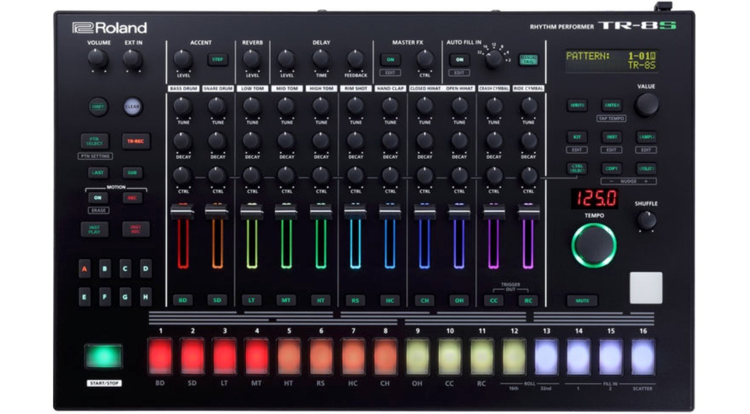 - 16x backlit per-step pads simplify pattern creation (supports patterns up to 32 steps)