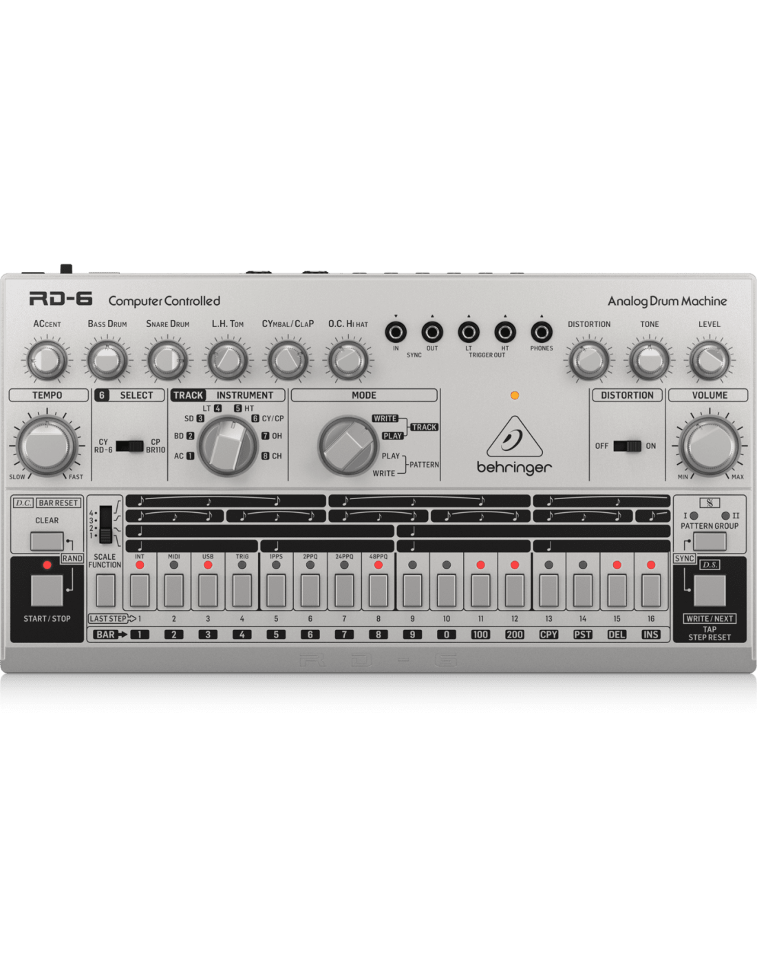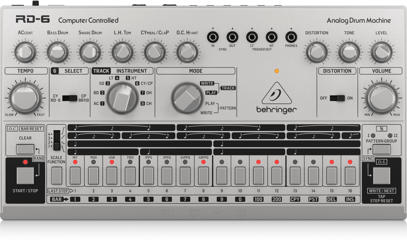 BEHRINGER RD-6-SR is an analog drum machine with 8 voices, a 16-step sequencer and a Global Distortion effect. The technical features include 8 analog drum sounds: bass drum, snare, low and high toms, cymbals, claps and hi-hats that can be selected with a dedicated knob, 16-step sequencer to go through 32 sound patterns, Global Distortion effect with level and tone control. It features Sync input/output, 2 Trigger outputs, headphone output, MIDI/USB implementation,